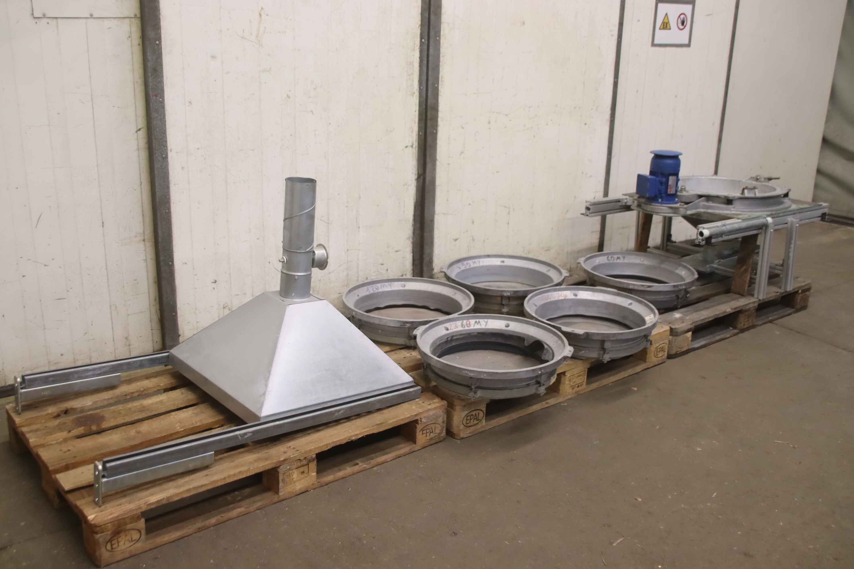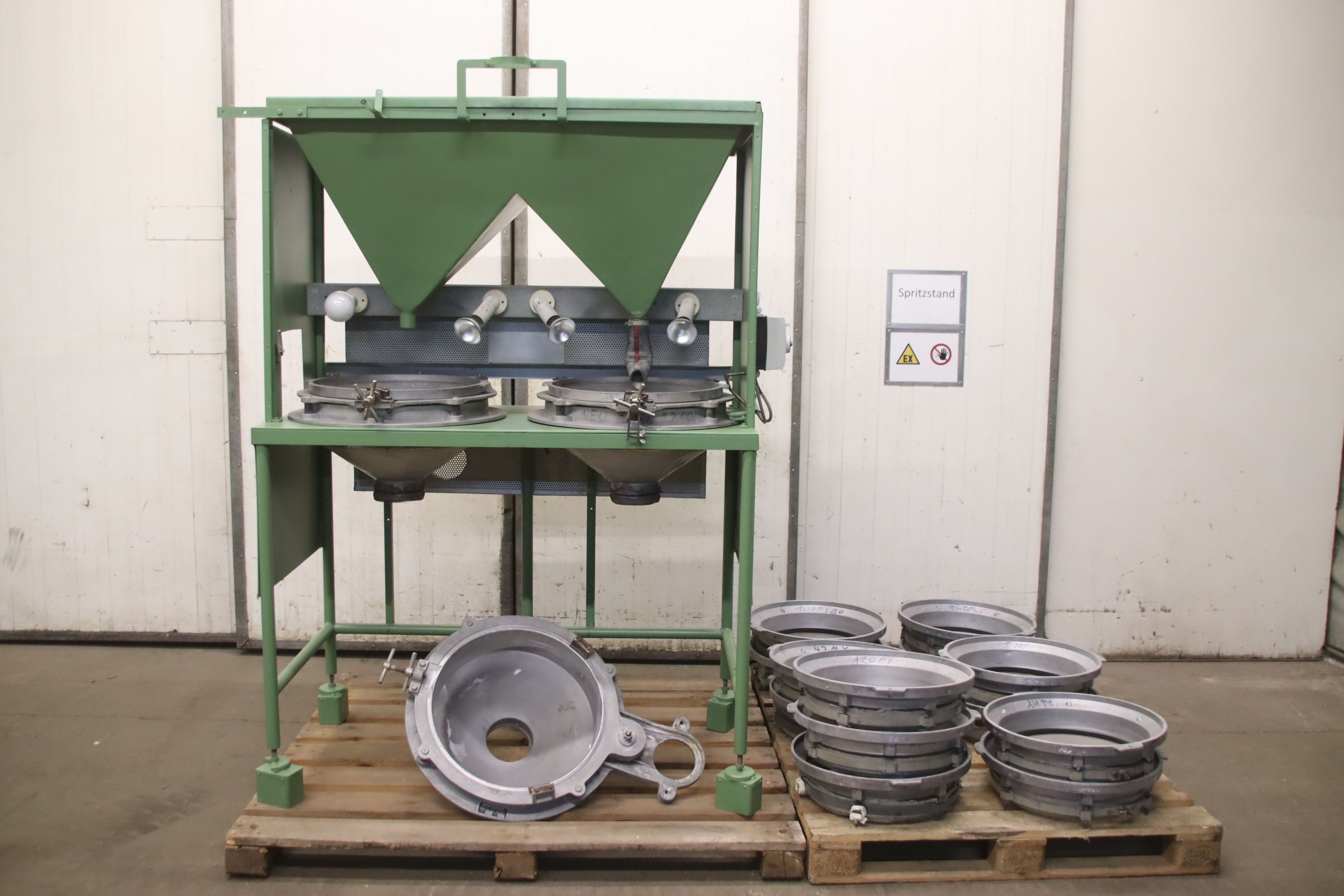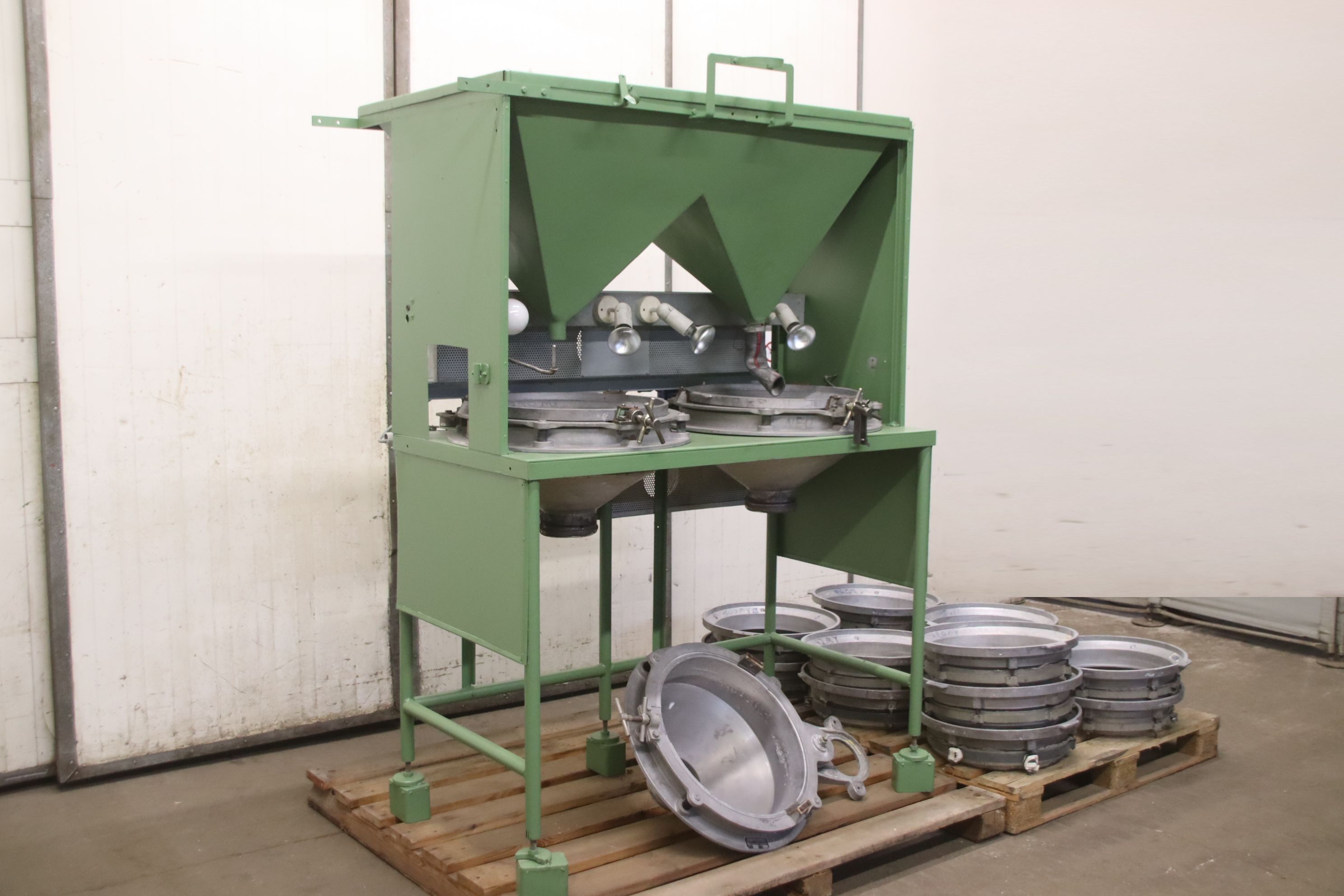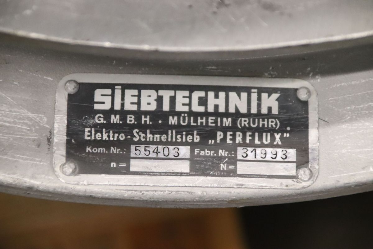 circular vibrating screening plant, screening machine, vibrating screen, vibrating screen, vibration motor, shaker, sorting system, shaking system, sifter, control screening machine, analysis screening machine -Manufacturer: Siebtechnik, control sieving machine Elekto-Schnellsieb with 15 sieve inserts -Type: Perflux for the production of grinding wheels -Sieve inserts: size 42 my to 250 my, see photo parts list -Screening machine: Dimensions 1530/1000/H2130 mm -Transport dimensions: 1600/1300/H2130 mm -Weight: 414 kg