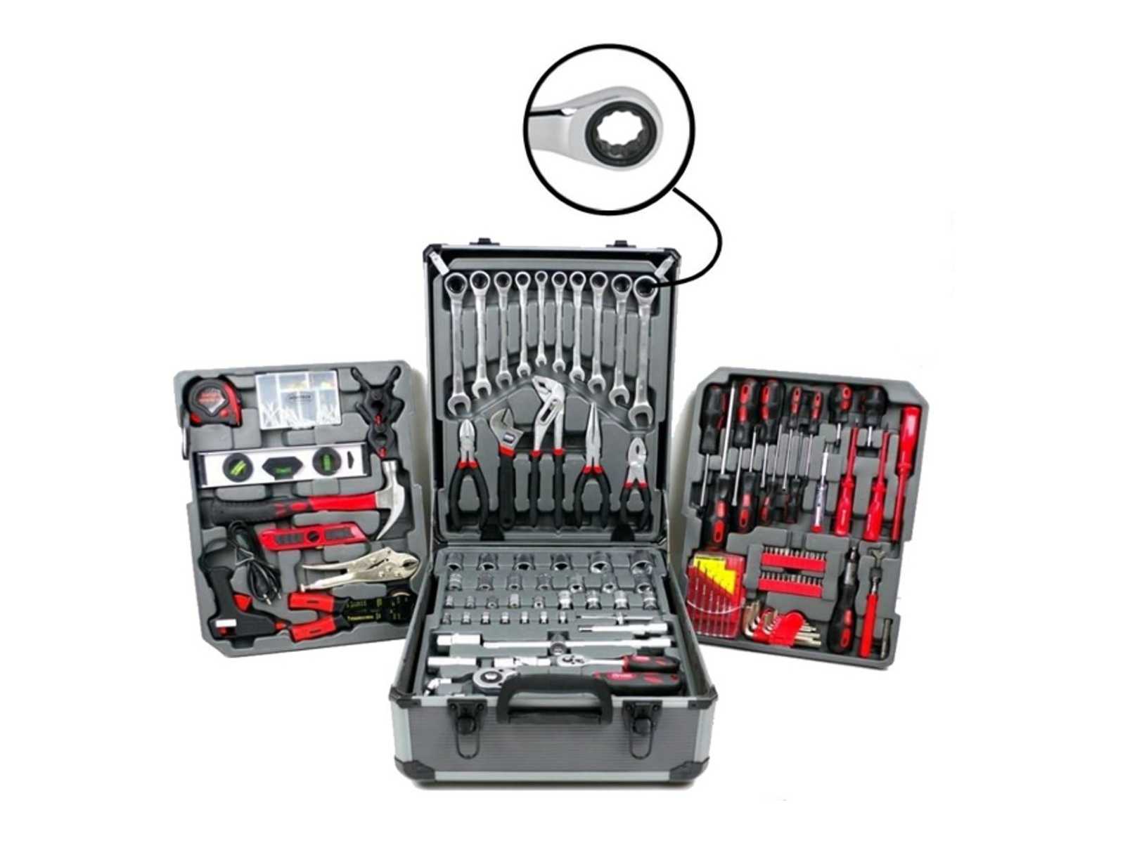 Wózek narzędziowy 299 części, kompletny zestaw z kluczami z grzechotką pierścieniową, w aluminiowej obudowie z kółkami i wysuwaną rączką, nowy w etui Auction-ID: A1-40417-188