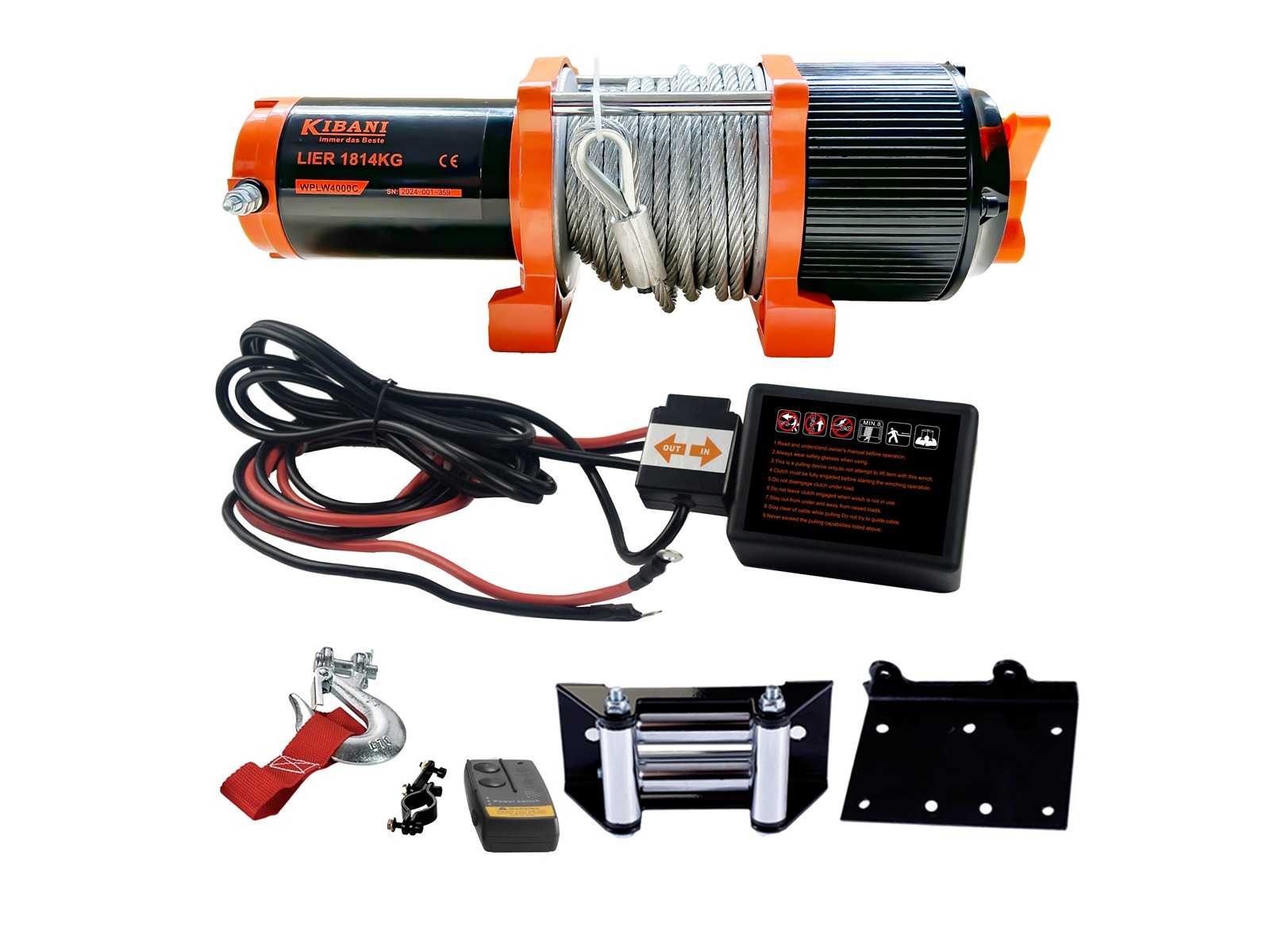 Waga 14 kg Wymiary: 35,4 × 11,7 × 12,3 cm Jazda Elektryczny Napięcie zasilania 12V Zasilanie 0,9 kW Przełożenie 128.2:1 Średnica kabla 6 mm Siła ciągniąca 1814 kg (4000 lbs) Prędkość kabla bez obciążenia 6,7 m/min Max. Obciążona prędkość kabla 1,7 m/min Włącznie z pilotem? Tak, 2 Długość kabla 13,5 metra Znaki jakości CE Auction-ID: A1-40417-338