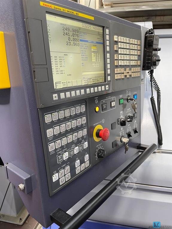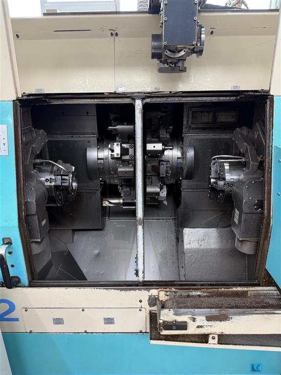 turning diameter:120 mmturning length:100 mmcontrol:Fanuc Spindle 1 power:7,5 kWSpindle 1 RPM:4500 1/minSpindle 2 power:7,5 kWSpindle 2 RPM:4500 1/minDistance between spindle noses:600 mmTurret No.1 stations / rotary tools:15/15 Power rotary tools turret 1:2,7 kWRPM of rotary tools turret 1:4000 1/minTurret No.2 stations / rotary tools:15/15 Power rotary tools turret 2:2,7 kWRPM of rotary tools turret 2:4000 1/minTravel x/z turret 1:250 / 300 mmTravel x/z turret 2:250 / 920 mmBar capacity spindle 1:51 mmBar capacity spindle 2:51 mmpower chuck:165 mm Spindle bore sp. 1:62 mmSpindle bore sp. 2:62 mmdimensions of the machine ca.:3700 x 2300 x 3000 mmweight of the machine ca.:5600 kgUsed CNC-2-spindle CNC turning and milling center with gantry loader- 2x 15 station turret-automatic gantry loader with turnaround station.14 station-magazin right sideMax. Parts size Ø 120 x 100 mmDoublegripper ...