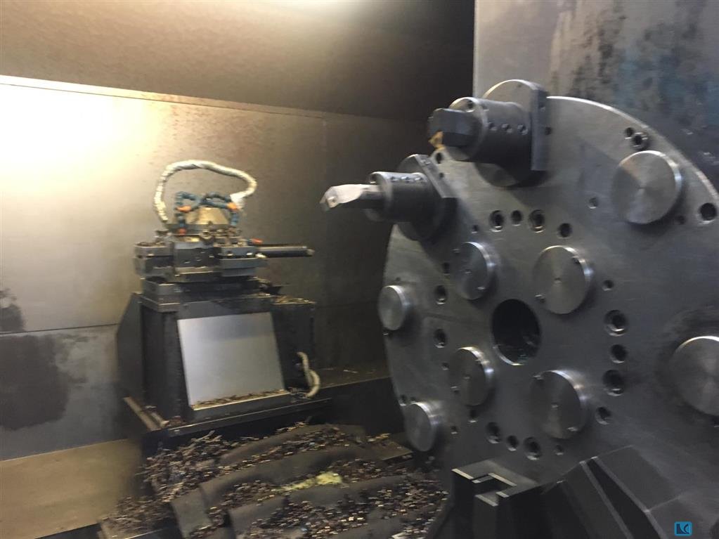 turning diameter:670 mmturning length:1540 mmcontrol:F31iB5 Celos Fanuc 35iB5swing diameter max. over bed cover:700 mmTravel turret No.1 (milling spindle) x/y/z:495 / ± 150 / 1562(+164) mmRotation B-axis:-30° / +210° Rapid traverse feeds turret 1 (milling head) x/y/z:40/40/40 m/minRPM milling spindle:12000 1/minpower capacity - milling spindle:20,2/18,8 kWTorque of milling spindle:120 / 44 Nmtool taper milling spindle:Coromant Capto C6 Tool magazine for milling spindle (turret 1):76 Tool change time tool/tool, milling spindle:1,25 sSpindle 1 RPM:3000 1/minSpindle 1 Power:36 / 30 / 25 kWC-axis spindle 1:0,001 °Bar capacity spindle 1:102 mmSpindle 2 RPM:4000 1/minSpindle 2 power:26 / 22 / 15 kWC-axis spindle 2:0,001 °Bar capacity spindle 2:80 mmdimensions of the machine ca.:7,8 x 3,6 x 2,9 mLinear scales on axis:X, Y programmable steady:KLU-A530 & SLU-X3.2 Spindle 1 Chuck:Kitagawa 250 ...