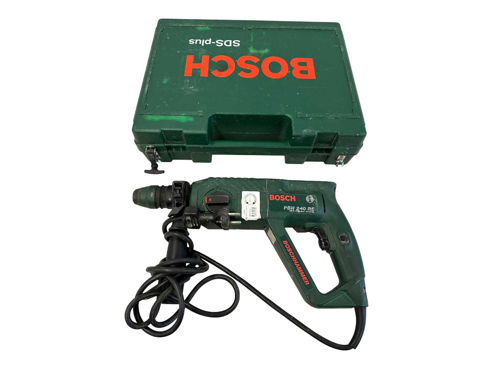 Model: Bosch PBH 240 RE Typ: młotek obrotowy SDS-plus Moc: 600 W Siła uderzenia: 2,7 dżula Szybkość uderzenia: 0–5 800 uderzeń/min Prędkość: do 800 obr./min Masa: ok. 2,5 kg Funkcje: wiercenie, wiercenie młotewkowe, dłutowanie Dodatki: Uchwyt na narzędzia SDS-plus Obrót zgodnie z ruchem wskazówek zegara i przeciwnie do ruchu wskazówek zegara Elektroniczna regulacja prędkości Zatrzymanie głębokości Dodatkowa rączka Skrzynka transportowa Waga wraz z opakowaniem około 4 kg Auction-ID: A1-45208-1036