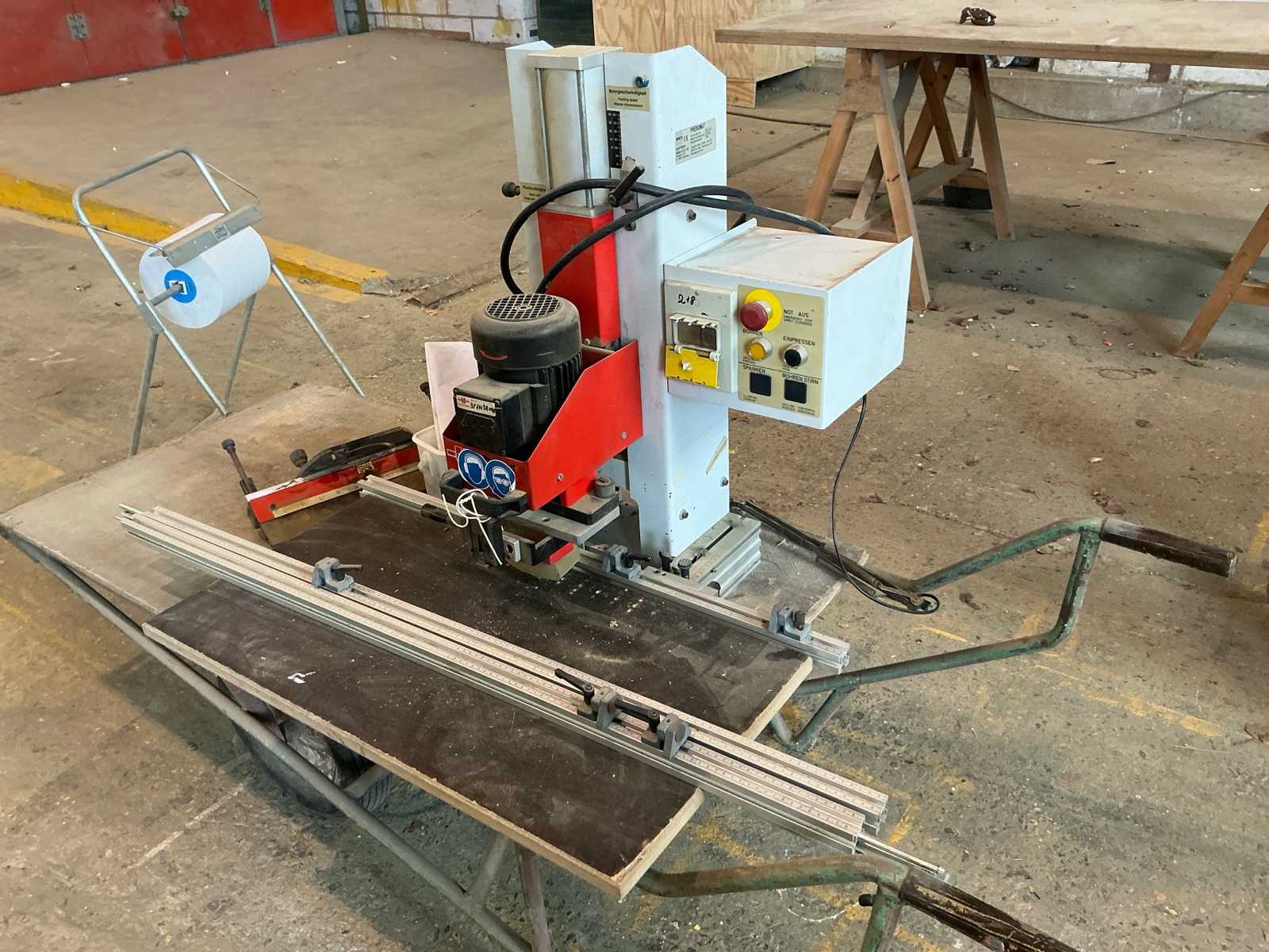 NUMER KATALOGOWY 6059 DANE TECHNICZNE - liczba wrzecion poziomych 2 × 20 sztuk - liczba wrzecion pionowych 1 × 20 sztuk - rozstaw ekstremalnych wrzecion 610mm - odstępy między wrzecionami 32mm - skok cylindra zasilania 60mm - maks. długość przedmiotu obrabianego: 3400 mm - regulacja wrzecion poziomych w górę / w dół, z przodu / z tyłu - regulacja w prawo / lewo w wrzecion pionowych - możliwość pracy na każdej aparaturze wiertniczej oddzielnie - wiertarka prawa - lewa, gwintowana (przykręcona) - 3 zaciski pneumatyczne - moc silnika 4 × 1,85 kW - zapotrzebowanie na powietrze 6-8 barów - wymiary długość / szerokość / wysokość 4600x1180x2200mm - waga około 1500 kg Cena netto: 15900 zł Cena netto: 3700 euro w zależności od ceny, 4,3 euro (Ceny mogą się różnić w zależności od większych wahań)