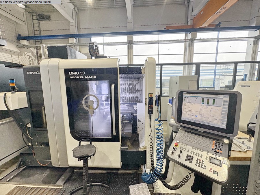 DMG MORI DMU 50 – 5-axis CNC machining center Manufacturer: DMG MORI / Deckel Maho Type: DMU 50, year of construction approx. 2013 5-axis machining center (simultaneous)CNC control: Siemens Sinumerik (ERGOline Panel) Travel: approx. X 500 mm / Y 450 mm / Z 400 mm Spindle: up to approx. 10,000 rpm, tool holder SK40 Tool magazine: approx. 30 places (chain magazine) incl. approx. 25 tool holders (used) Spindle condition good, machine accuracy good Operating hours: approx. 28,000 h Machine functional, currently energized Coolant system available Chip conveyor available Complete machining center incl. peripherals Ideal for 5-axis machining in tool and mould making as well as general machining Auction-ID: 04K-92D-1