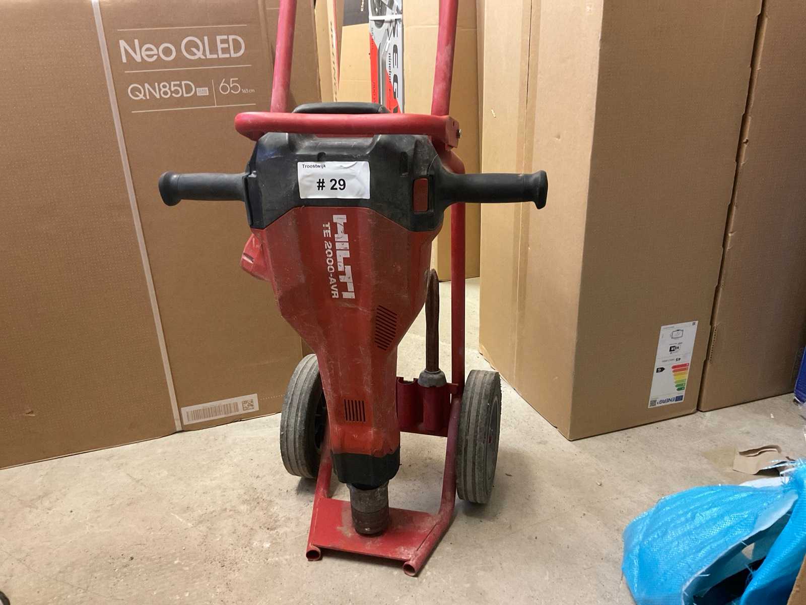 Technical data Manufacturer: Hilti Type: TE 2000-AVR Machine Type: Electric demolition hammer / chisel hammer Item number: 2139862 Serial Number: 060052 Year of construction: 06/2021 Connection: 220–240 V~ Frequency: 50/60 Hz Power: 2100 W CE marking: available Configuration Execution: Mains-powered demolition hammer with AVR vibration damping Application: Demolition and chiseling work in concrete and masonry Nameplate: available Accessories: Trolleys Auction-ID: A1-44707-28