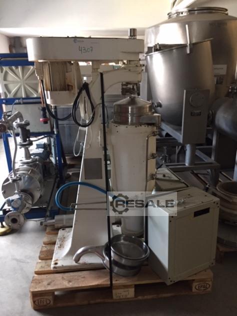Centrífuga de disco autolimpante usada feita pela Alfa Laval, tipo: MRPX 410 TGD 74. Novo 1988. Capacidade: 7.500 litros/h. Dados técnicos: - Função: separador de leite, - Capacidade de desnatamento de leite: 7.500 l/h, - Capacidade de desnatamento de soro de leite: 10.000 l/h, - Eixo da roda sem-fim: 1420 - 1500, - Potência total instalada: 18,5 kW (1460 rpm), - Contador de RPM: 118-125, - Inclui ferramentas (chaves inglesas), controle, base, - Tensão: 380V / 50 Hz / 3 fases, - Aço inoxidável.