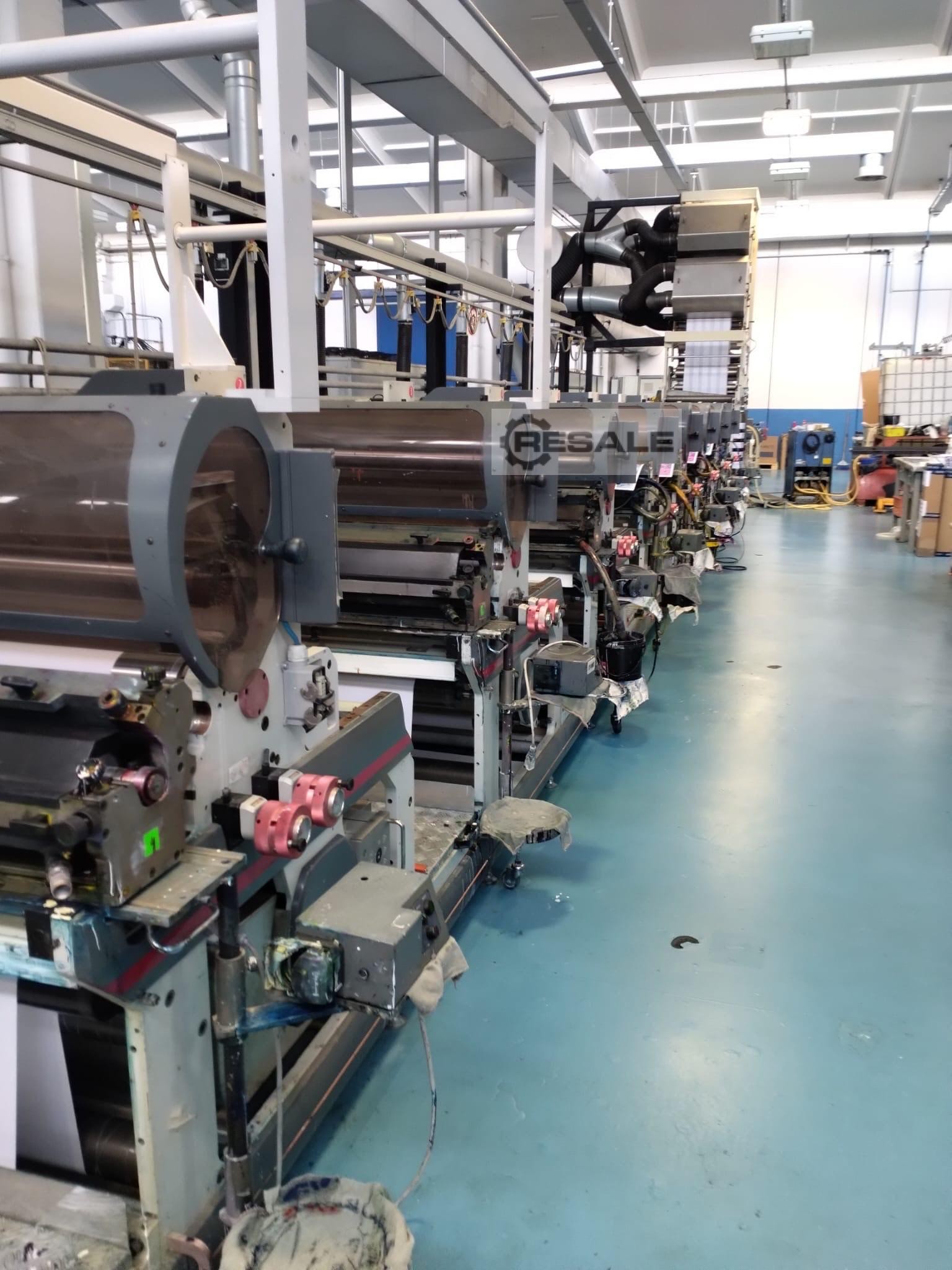 Largura de impressão: 330 mm Diâmetro máximo de desenrolamento: 1000 mm Diâmetro máximo de rebobinagem: 1000 mm Todas as estações UV (GEW) Rolos de chiller Delam-Relam Folha fria Laminação Tratamento Corona Câmara Web - BST Estação de corte rotativa dupla, 1 Gap Master Possibilidade de corte de chapas