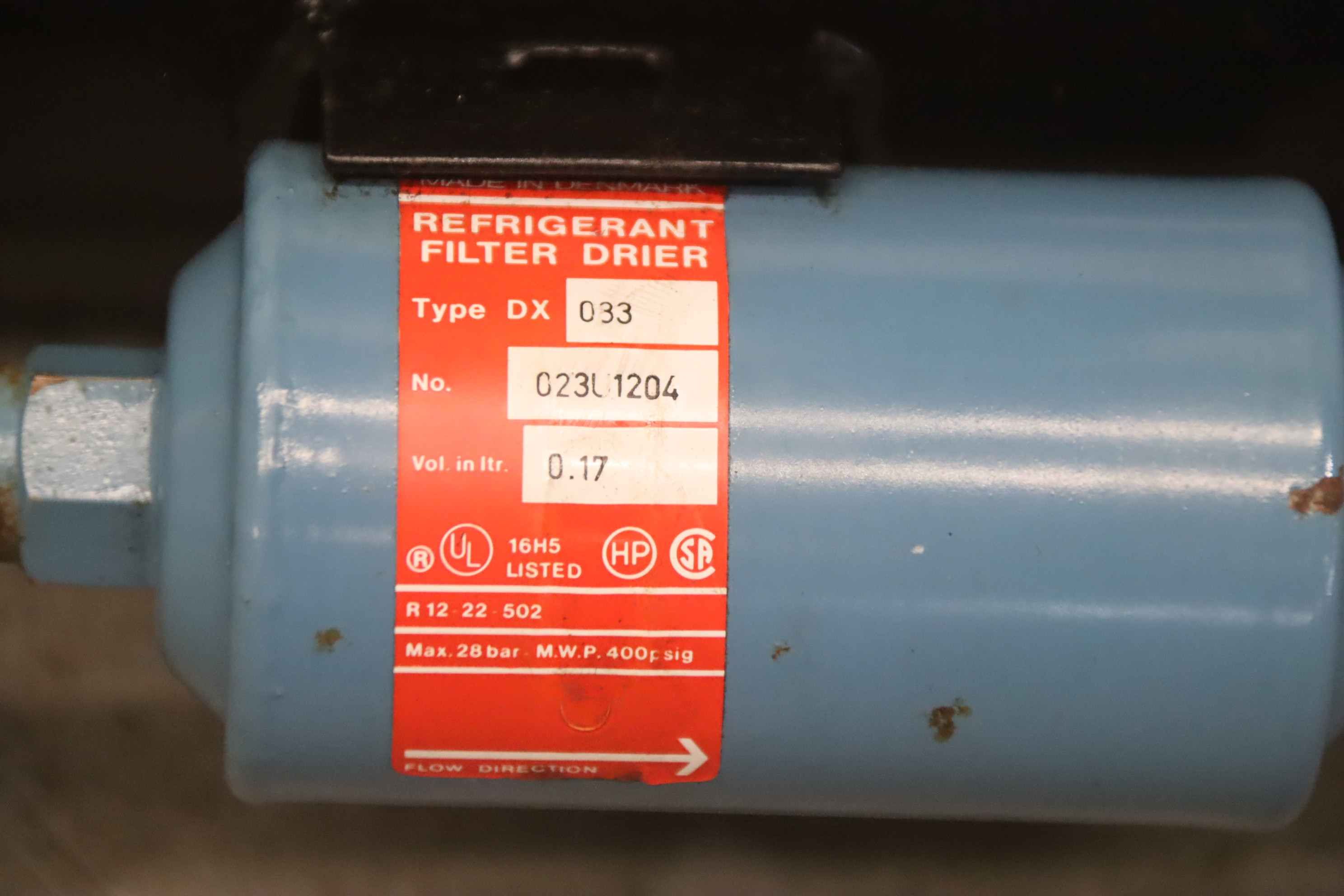 Refrigeration compressor, refrigeration machine, refrigeration compressor, refrigeration unit, refrigeration compressor, compressor, liquid collector, refrigeration unit, liquid separator, filter dryer housing, filter dryer, filter drier, liquid filter dryer-Manufacturer: Danfoss, liquid collector with filter dryer-Filter dryer: Type: DX 033-Permissible operating pressure: 28 bar-Individual components: see photos-Dimensions: 190/180/H360 mm-Weight: 6.1 kg