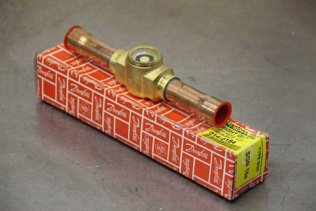 Refrigeration compressor, refrigeration machine, cooling compressor, refrigeration unit, cooling compressor, compressor, filter dryer housing, shut-off valve, ball shut-off valve, temperature switch, thermostat, expansion valve, thermo-expansion valve, indicator sight glass-Manufacturer: Danfoss, indicator sight glass, unused in original packaging-Type: SGN 16s HFC-HCFC 014-0184-Connections: 16 mm 5/8 ODF-Price: per piece-Number: 5 piece-Dimension package: 190/40/H40 mm-Weight: 0.2 kg/piece