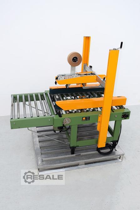 Dispositivo de vedação semi-automático com formatação manual que sela a parte inferior e superior das embalagens com fita autoadesiva.