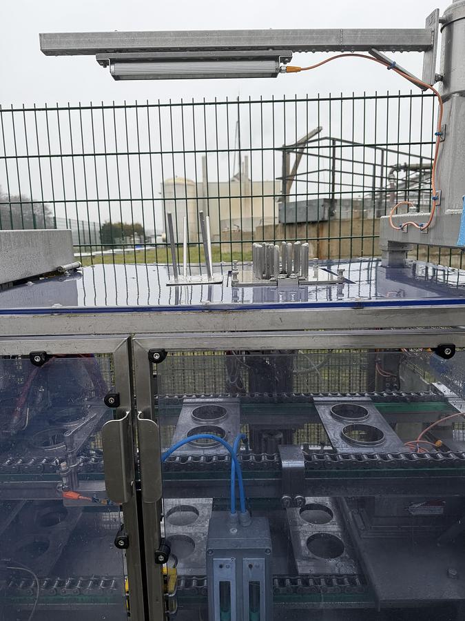 Set packer for glasses, packing pattern 3 x 4., The pre-grouped glasses are transferred into the prefabricated tray using vacuum suction cups., The 2013 VestTech Jar Packer is a reliable solution for the packaging industry, specializing in the precise and safe packaging of jars. The unit has a solid construction designed for long-lasting use in demanding production environments. With its user-friendly operation and high efficiency, this jar packer offers an ideal combination of performance and reliability. It is perfect for companies looking for a cost-effective way to optimize their packaging processes. With the VestTech Jar Packer, you can ensure that your products are packaged safely and precisely, resulting in improved productivity and higher customer satisfaction.