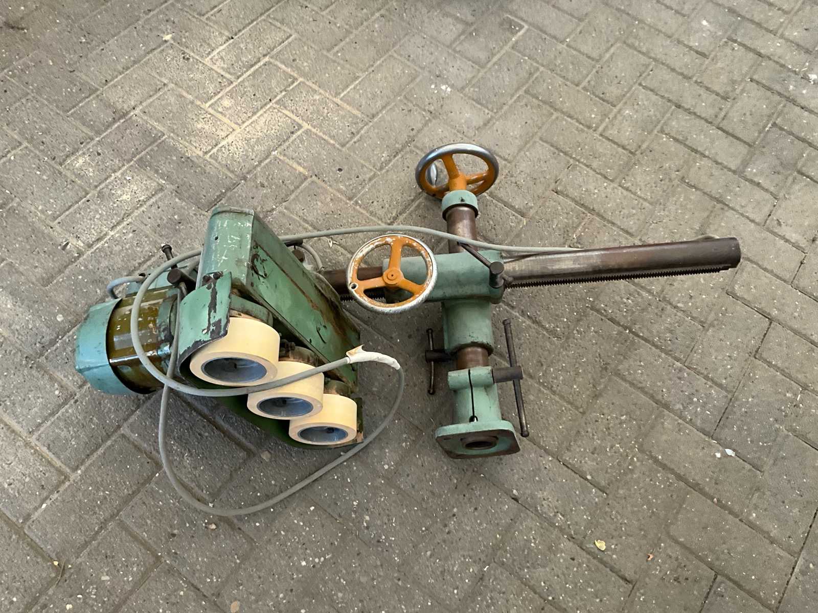 Very robust and solid industrial roller machine / transit device, originating from German mechanical engineering. Ideal for applications in woodworking or workshops where material needs to be passed in a controlled manner. The machine is equipped with multiple drive rollers and a sturdy adjustable arm, making it perfect for use as a feed or feed system for sawing, planing or milling work. Classic German quality – built to last - Power supply: electrically powered Number of rollers: 4 drive rollers Feed system: mechanically driven rollers Speeds (adjustable): approx. 2 – 12 m/min (depending on position) Gear Modes: Multiple positions via shifting/gearing Installation: Equipped with adjustable arm + clamping system (attachment to machine bench) Adjustable: Height Position Pressure/Conductivity - State Used condition (visible signs of wear) but functional, Complete with cables and cont ...