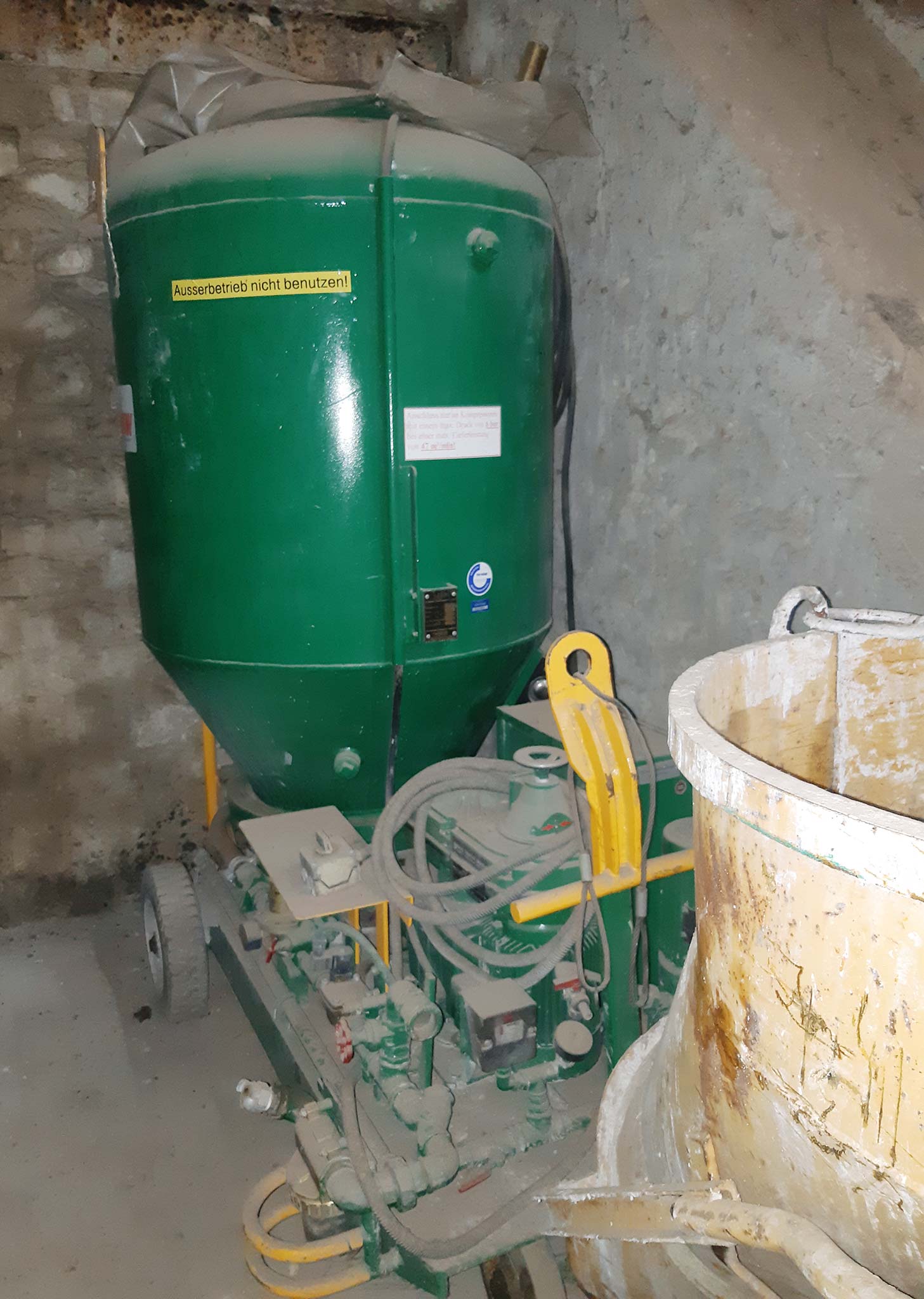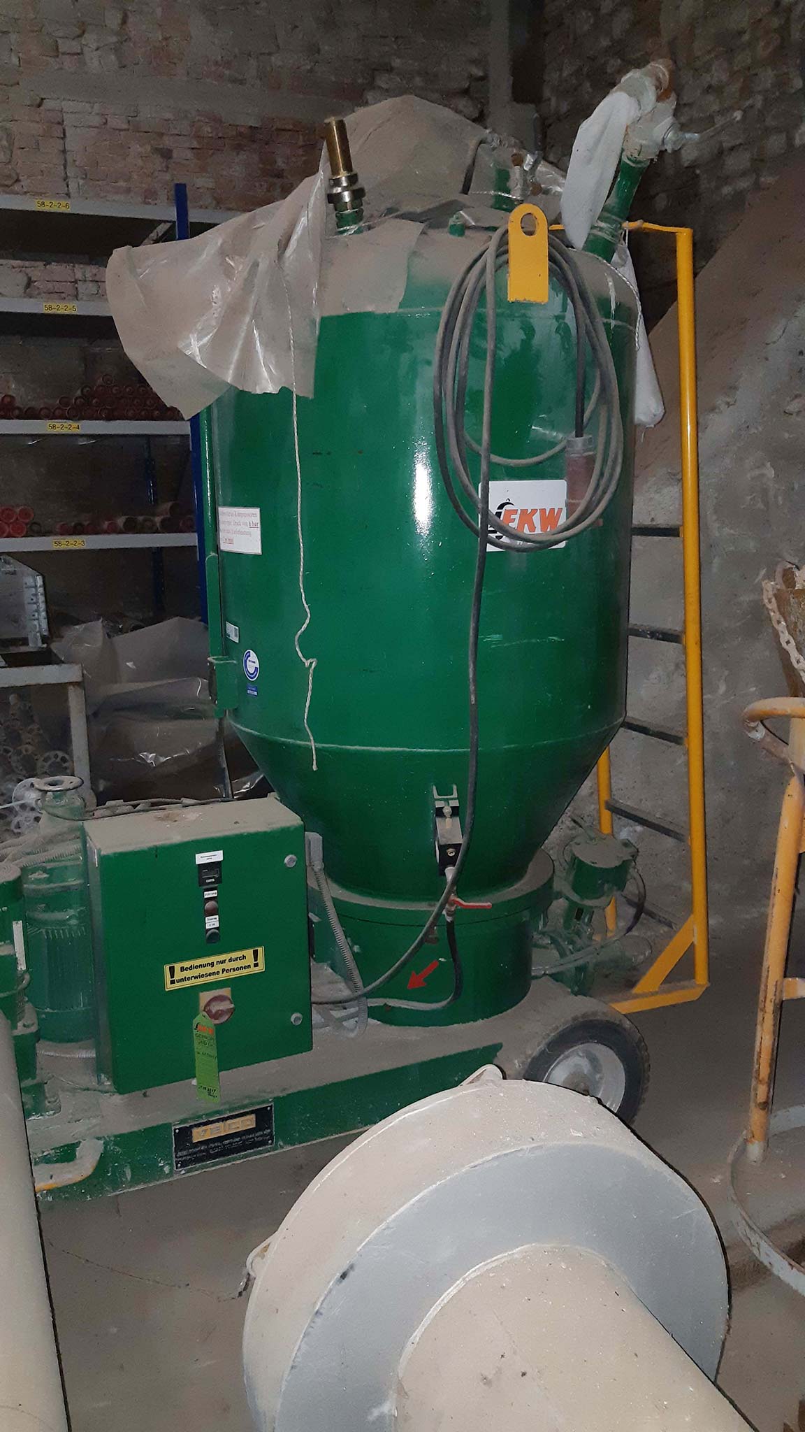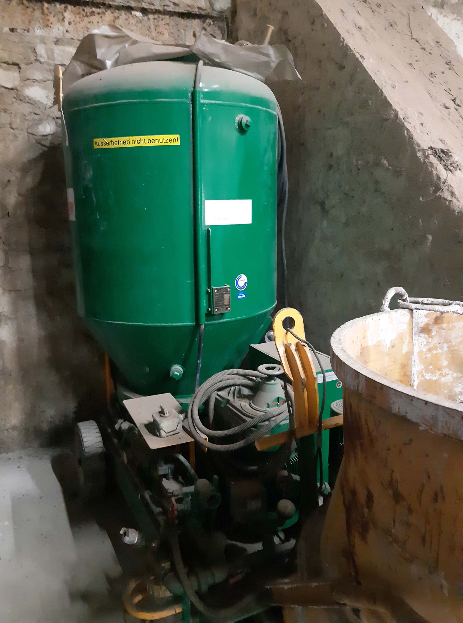 Injection material blowing pressure: 0.5-6bar, Drive: variable gearbox Lenze, Elements: material hose, blow-out nozzle, directional valve, swivel lever, exhaust valve, valve, nozzle, pressure reducer, handwheel, slide gate, control cabinet, control switch, water hose, needle valve, nozzle mixing body. Overhauled by the manufacturer in 2014. With pressure vessel and documentation. An on-site inspection is possible.