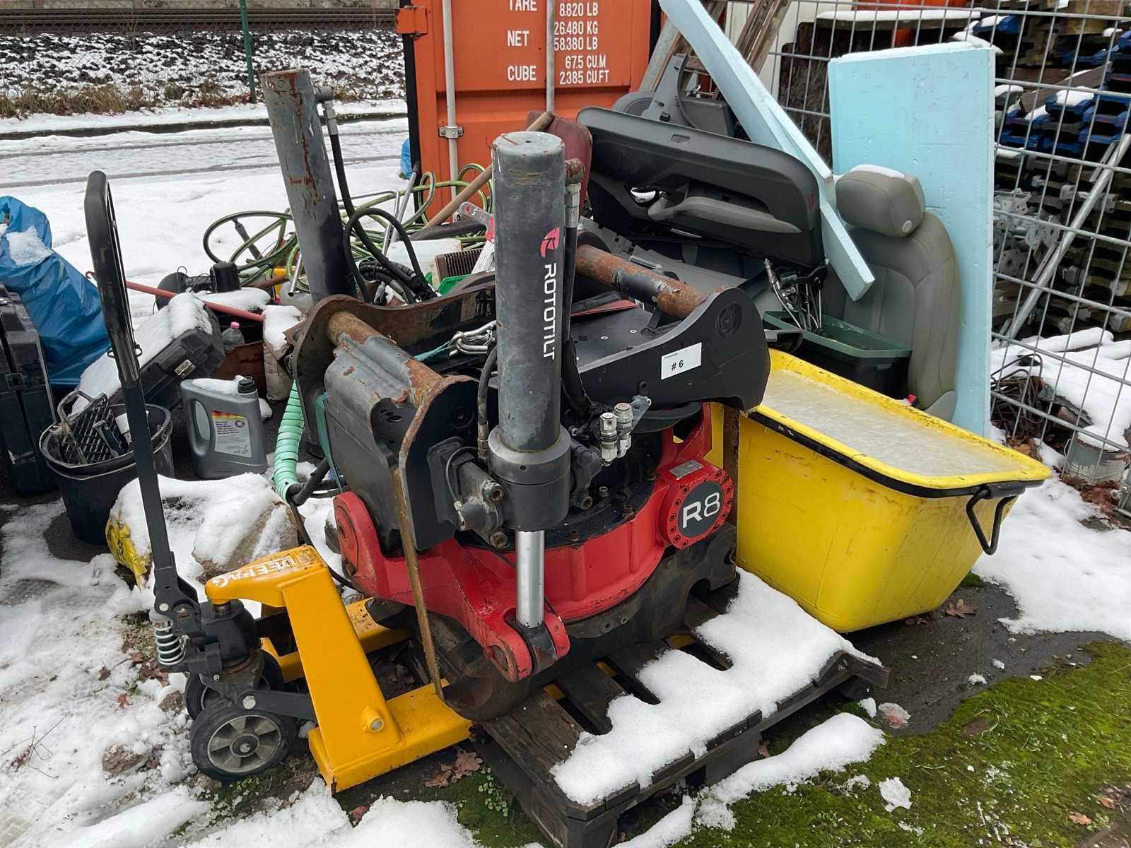 Technical data Manufacturer: Rototilt Type: R8 Serial Number: 30228 Machine Type: Tiltrotator (Source: online) Year of Make: 2016 Net weight: approx. 730–760 kg (source: online) Recommended excavator weight: approx. 23,000–32,000 kg (source: online) Recommended oil volume: approx. ≥134 l/min (source: online) Operating pressure: approx. 250 bar (Source: online) Max. breakaway torque: approx. 330 kNm (Source: online) Max. breakaway force: approx. 200 kN (Source: online) Swivel angle: approx. ±40° (Source: online) Rotation speed: approx. 1 revolution / 8 s (Source: online) Configuration Execution: Hydraulic tiltrotator for excavators (Source: online) Quick-change system: QuickChange™ / SecureLock™ compatible (Source: online) CE marking: available (source: online) Auction-ID: A1-44707-6