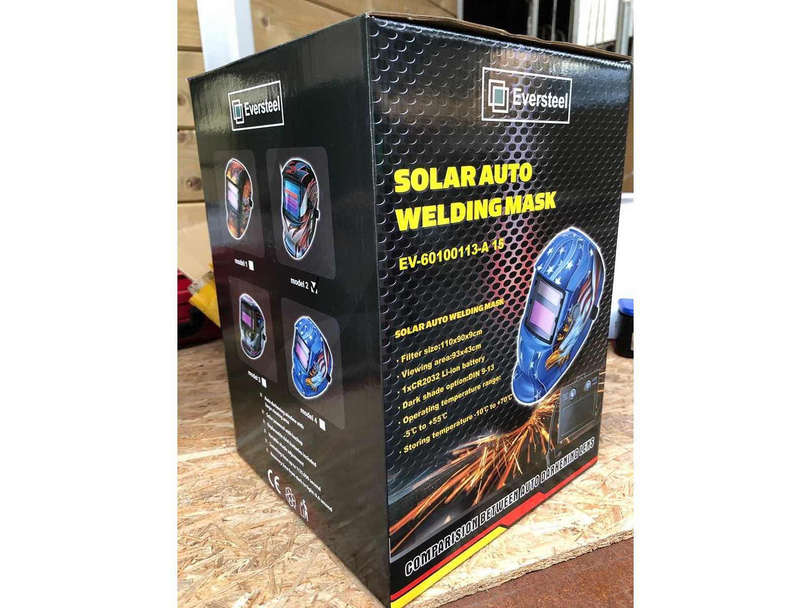 Welding helmet model 1. This automatic welding hood is suitable for all welding processes. Viewing window size approximately 93x43 mm with UV and IR protection. Switches off automatically. Blackout degree infinitely adjustable from the outside from DIN 9 - 13. Filter switch-on speed: 1/25000 second, from light to dark. Response time filter 0.6 seconds, from dark to light. Fully adjustable bridle with washable sweatband. Works on solar cells and if necessary on AAA batteries, battery life approximately 4000 hours, including AAA batteries. CE approved. Auction-ID: A1-40417-190