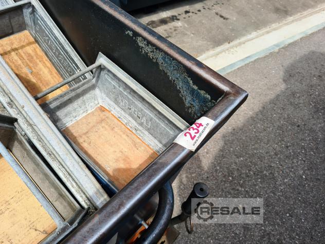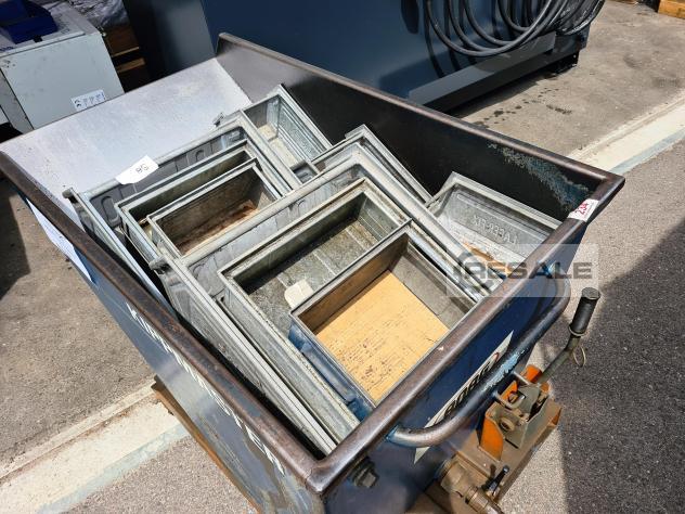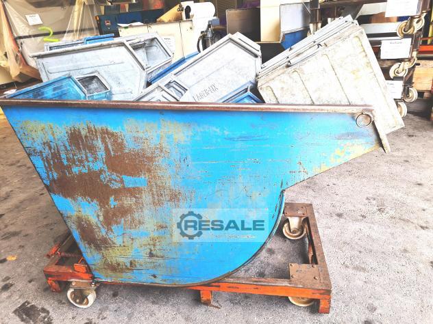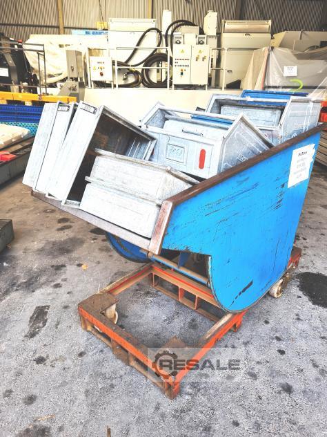 inclinação do recesso, intervalo de chips, Vagões de batatas fritas, Empilhador, Balde de sucata Dimensões: largura x comprimento x altura (aprox. 94 x 76 x140 cm) Altura total: aprox. 118 cm 4 rodas cabo braço roqueiro Torneira de saída Portátil com empilhadora Vendido como mostrado com várias caixas de aço de chapa. Toda a informação sem garantia