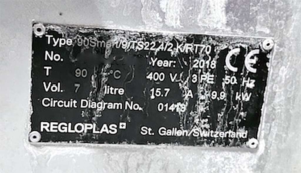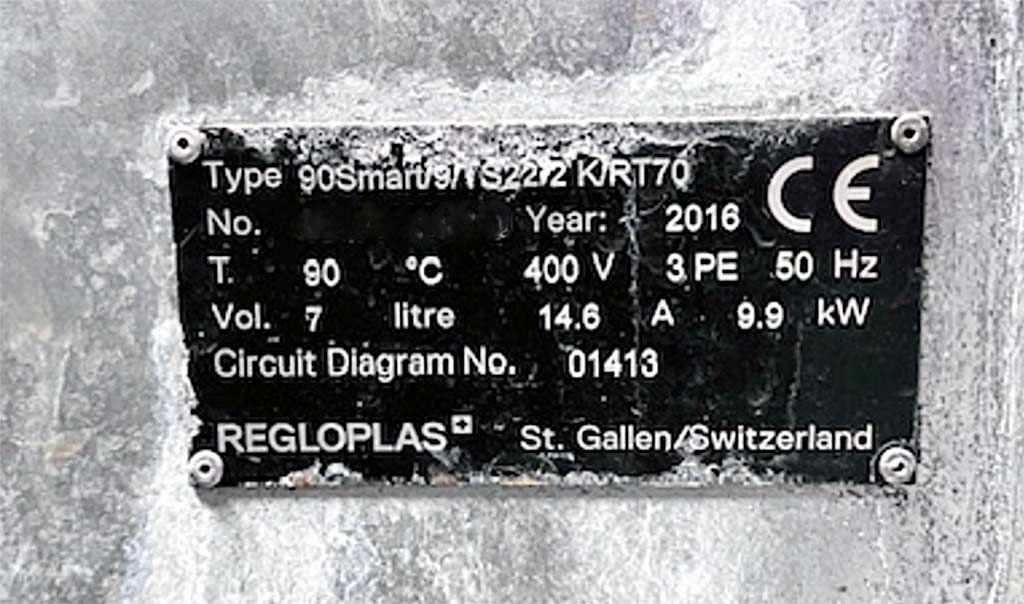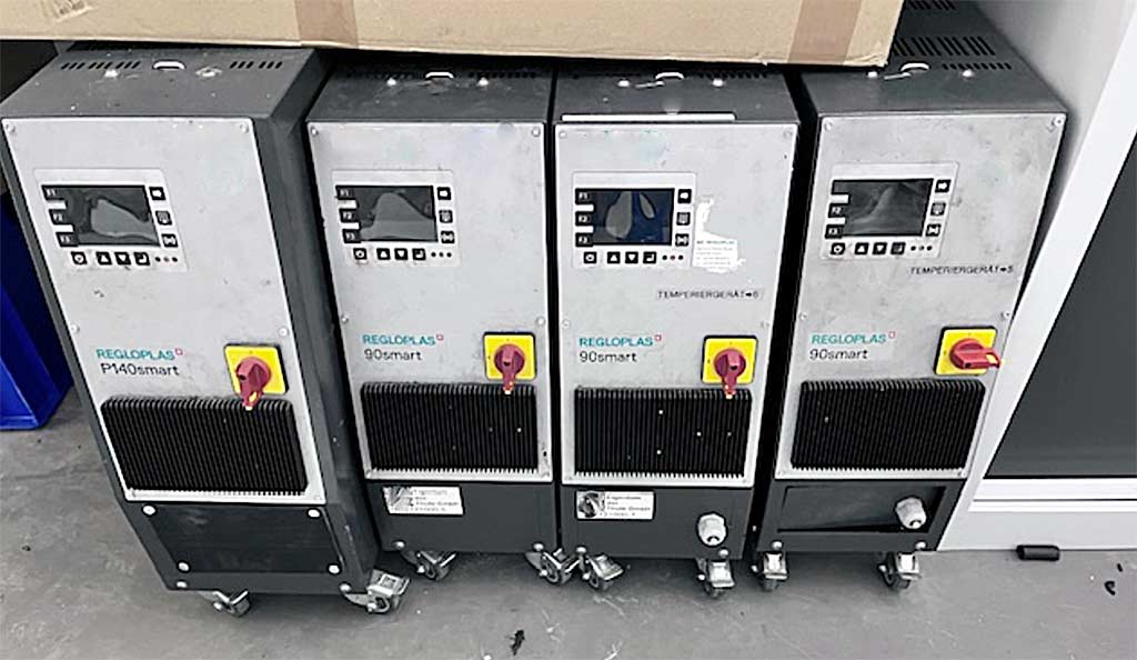 Estão disponíveis quatro unidades de controlo de temperatura da série Regloplast Smart. 3x Regloplast 90Smart, ano de fabricação: 2018/2018/2016, T. max.: 90C, dimensões X/Y/Z: aprox. 200mm/560mm/600mm, peso: aprox. 50kg, alguns interruptores de flutuação e display defeituoso. 1x Regloplast P140Smart, ano de fabricação: 2020, T.max.: 140C, dimensões X/Y/Z: aprox. 200mm/560mm/600mm, peso: aprox. 50kg. Documentação disponível. É possível uma inspeção no local.