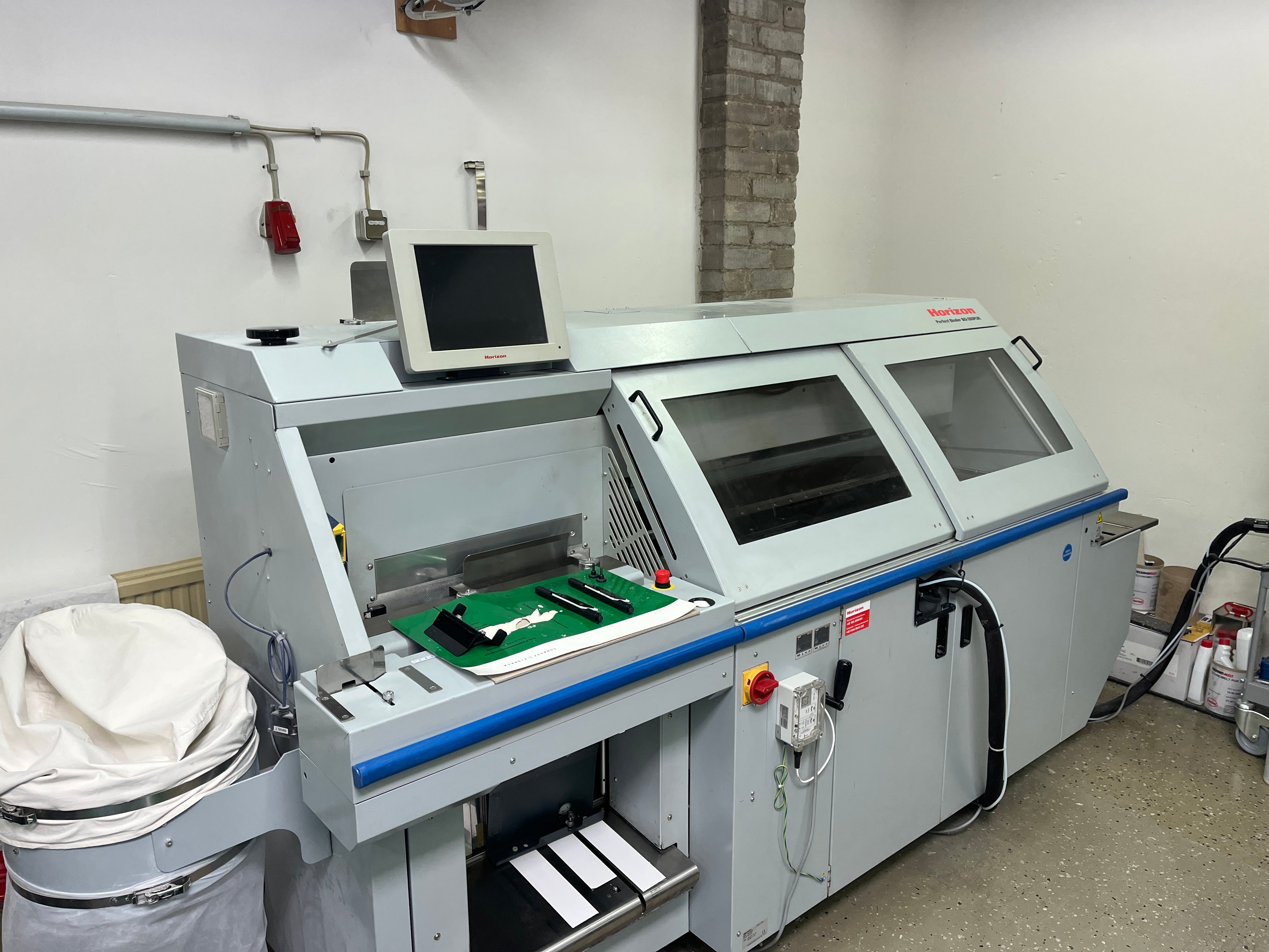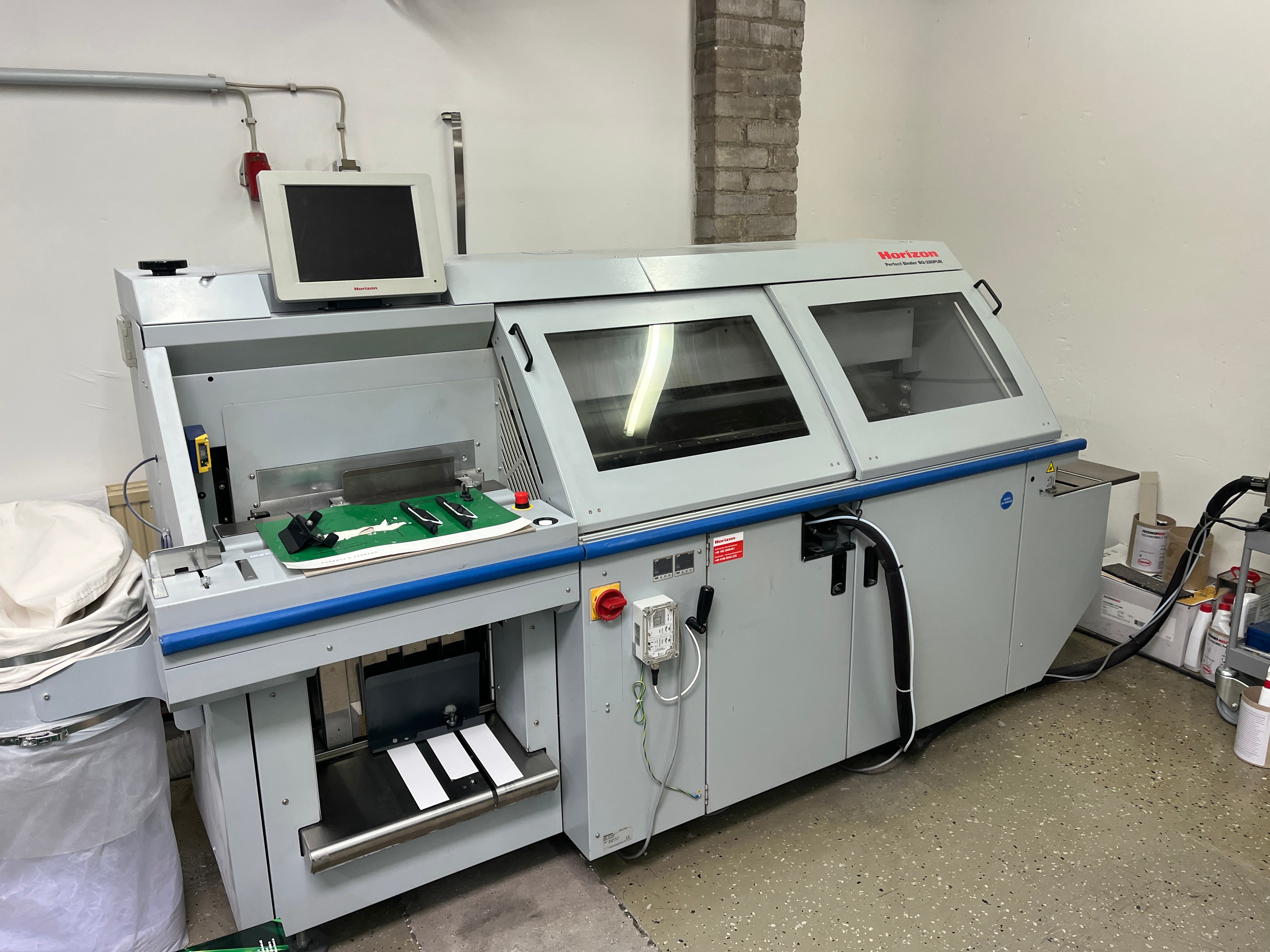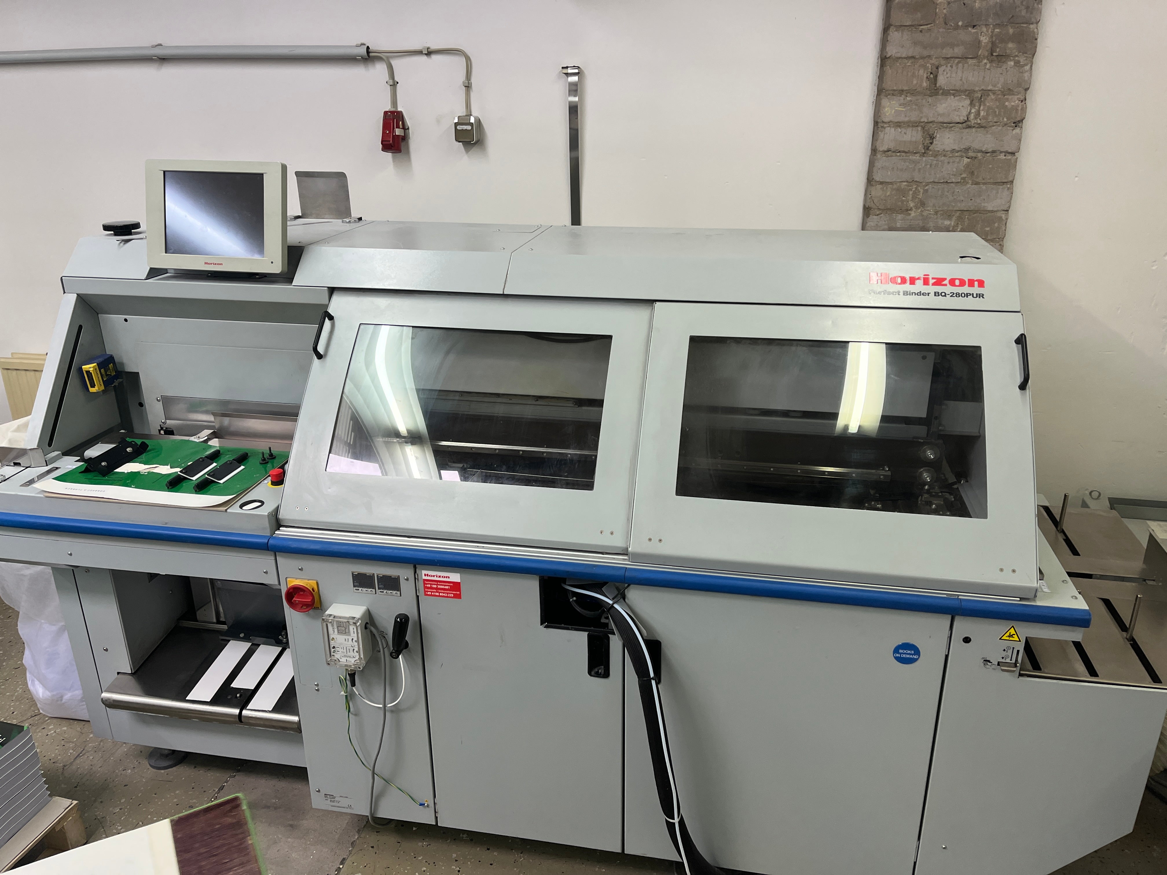 Horizon BQ 280 Year: 2013 Counter: approx. 700.000 ? 1 CLAMP PERFECT BINDER - clamps: 1 - spine gluing: PUR - glue refill: by pre melter - sight gluing: hotmelt - book block thickness: integrated monitoring station (outside the clamp) - milling section: with extraction - milling depth: adjustable - cover feeder: suction drum feeder with 4x scoring - technology: touch &, work - saveable jobs: 200 memories for repeat orders - sheet size: max: 385 x 320 mm, min: 135 x 105 mm - cover size: max. 660 x 385mm, min. 240 x 135mm - book thickness: max. 50mm, min. 1mm - cover weight range: 90 - 300 g/sqm - cover pile hight: max. 70mm - speed: max. 500 cycles/h - dimensions: 3.055 x 905 x 1.520mm - power: 400V/ 50Hz - 2,7kW - weight: 900kg