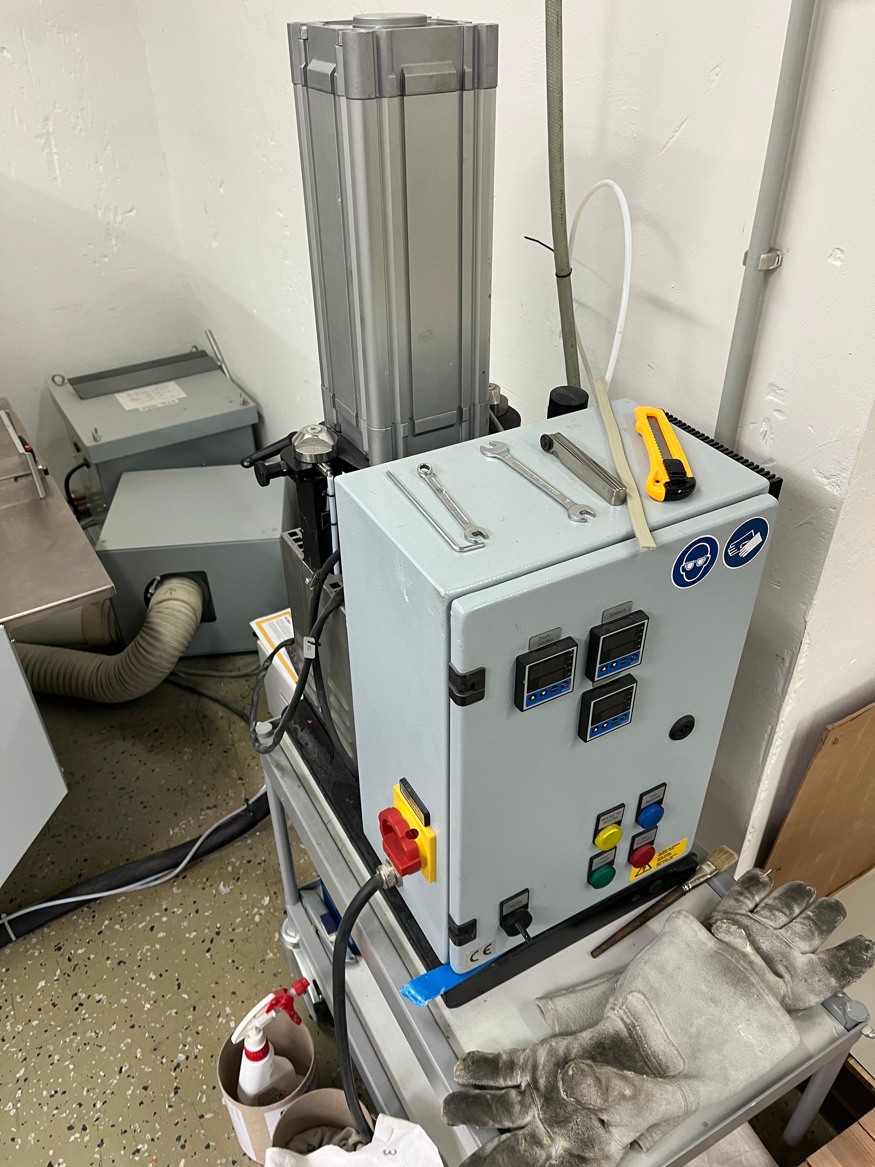 Um sistema de estampagem a quente está disponível para estampar a borda prateada nos painéis de instrumentos. Capacidade de aquecimento: 5,6 kW, força de estampagem: 20 kN, pressão máxima: 6 bar. Incluindo o módulo de fluxo laminar Spetec Super Silent. Documentação disponível. É possível uma inspeção no local.