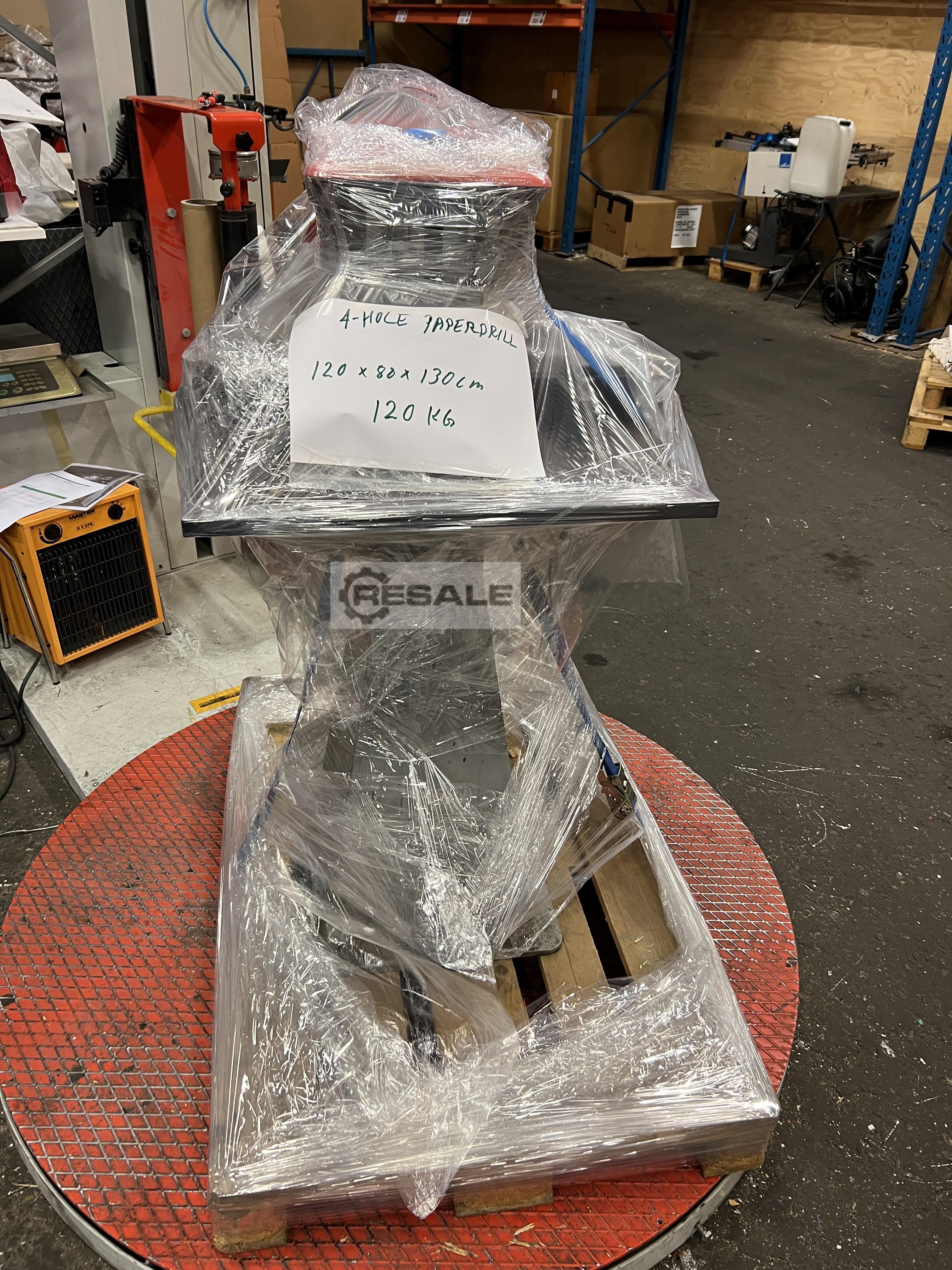 Máquina de perfuração de papel de 4 furos, com equipamento de série e brocas. Em condições de produção pronta. Na palete: 120 x 80 x 10 cm