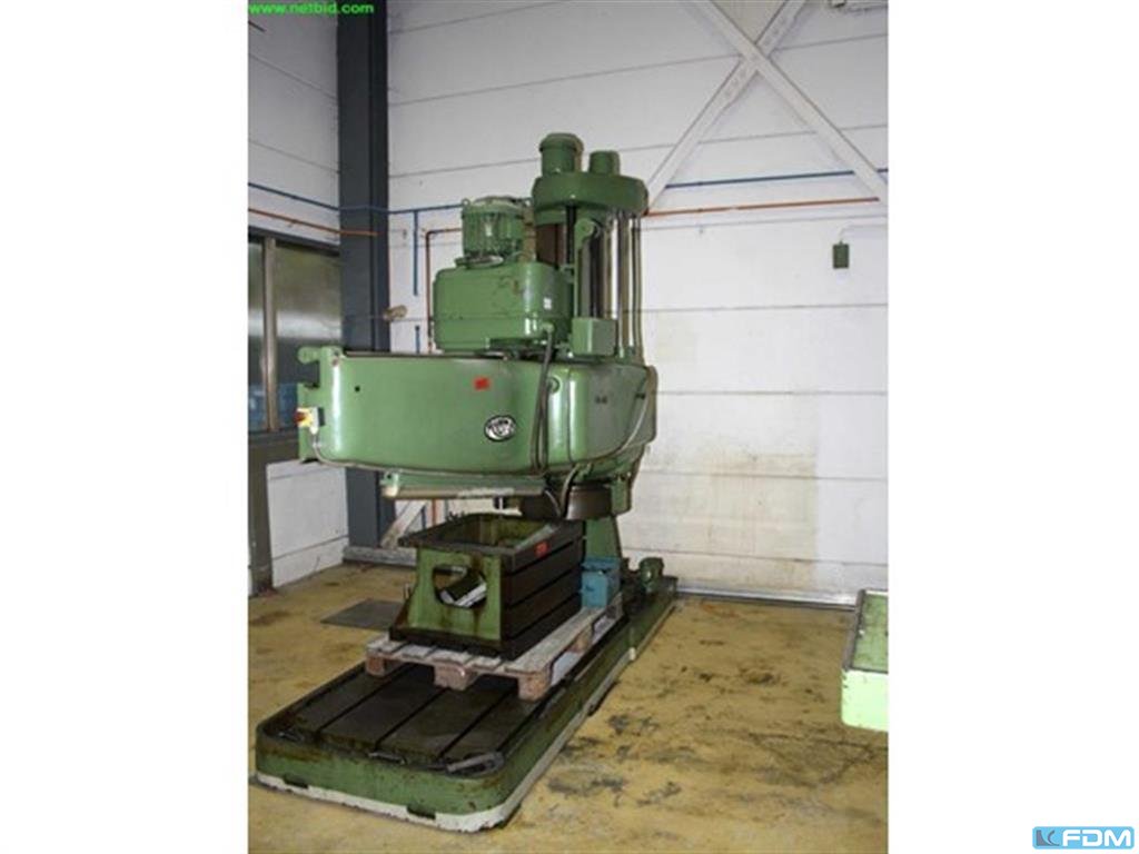 Producent: RABOMA Modelu: 12Rh1600 Rok produkcji: 1957 Typ maszyny: Wiertarka promieniowa Specyfikacja techniczna: - Max. Wydajność wiercenia (materiał pełny): 75 mm - Średnica wrzeciona: 114 mm - Stożek wrzeciona: MK 5 - Przesuw wrzeciona: 500 mm - Moc napędu: 7,5 kW - Zakres prędkości: 14 – 1 400 obr./min Wymiary stołu roboczego: - Powierzchnia górna: 750 × 1 000 mm - Powierzchnia boczna: 530 × 1 000 mm - Płyta podstawy: 1.000 × 1.600 mm Regulacje i ruchy: - Regulacja wysięgnika: - Pionowo: 1 000 mm - Poziomo: 950 mm (zamykany na klucz) - Regulacja suwaka wiertła: - Poziomo: 1 000 mm - Zakres obrotu wysięgnika: