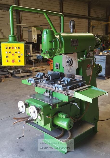 Fabrikat Reckermann Nazwa Frezowanie maszyny Typ Uni 1000 Wrzeciono poziome i pionowe z uchwytem na narzędzia SK40 Oś X głowicy obrotowej z regulacją do 45 Podróż: Y:260 / X:640 / Z:330mm Posuw: zmienna regulowana od 0-600mm /min szybka reakcja Akcesoria: Vice, (regulowany) 2 szt. o tej samej wielkości patyczki śrubowe, z których jeden nie ma wrzeciona trapezowego. Maszyna jest w bardzo dobrym, dobrze utrzymanym stanie! Masa całkowita: około 3,2 t Lokalizacja robaków. Wizyta możliwa po uzgodnieniu.