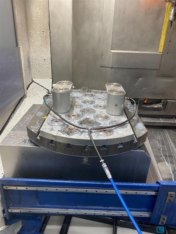 x-travel:1000 mm y-travel:1100 mm z-travel:810 mm control:iTNC 530 HEIDENHAIN turning speeds:18000 1/min tool taper:HSK 63 table surface area:1.000 x 800 mm max. swing dia.:1350 mm max. table load:1.000 kg tool magazin::273 Pos. rapid traverse:60 m/min total power requirement:86 kW weight of the machine ca.:18 t dimensions of the machine ca.:4,3 x 6 x 3,4 m 5-axis simultan universal machining center, NC-rotary-table (C-axis) and B-axis (milling head), DDT-spindle for high torque (HT - max. 3000 rpm - 291/226Nm) and high speed (HS max. 18.000 rpm - 83/63Nm ),- internal coolant supply 50bar with chipconveyor and paperfilter, el. handwheel, oilmist suction, DCM collision control, Hours on counter: approx. 45.000h "machine on", approx. ca. 2.000h " HT-spindle on", approx. ca. 12.000h " HS-spindle on" NEW SPINDLE IN 09/2025 !