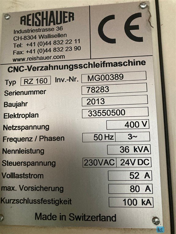 max. wheel diameter: 0 mm gear width: 120 mm max. module: 3 min. module: 1 total power requirement: 20 kW weight of the machine ca.: 7,5 t dimensions of the machine ca.: m : : : : : : 5 machines in stock, YOM: between 1986 and 1990 Gear Æ, min./max. 55 / 120 mm Gear Æ for shaft-formed parts 80 mm Module (pitch 25.4 - 8.5) 1 - 3 No. of teeth, min./max. 13 / 80 Pressure angle 14 - 30 ° Helix angle, max. 40 ° Workpiece clamping length 145 - 420 mm Grinding worm Æ 300 - 400 mm Grinding worm width 25 - 40 mm Grinding worm speeds, infinitely variable (35 m/s) 1,650 rpm Feed range 0.4 - 4 mm/rev Total electrical load 20 kW - 380 V - 50 Hz Weight 7,500 kg Accessories / Special Features REISHAUE ...