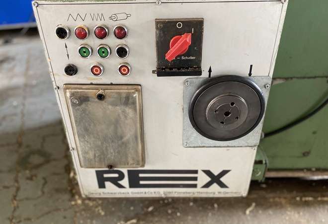 REX F-59S Costruita nel 1988 Potenza del motore: 6 / 8 kW (corrente nominale: 16A) Intervallo di rotazione da -10° a +45° Velocità: 3ª / 4,5 / 6ª / 9.000 giri/min Mandrino di fresatura: 30 + 40 mm Regolazione di altezza e ruvolazione tramite volante Interruttore selettore per la rotazione sinistra/destra Pannello di controllo in alto (all'altezza degli occhi) Presa per la velocità di alimentazione Freno motore inclusi 2 estensioni di tabella Dimensione del tavolo: 97,5 x 88 cm Ugello di aspirazione 2 x 120 mm Peso circa 800 kg Dimensioni di trasporto W x D x H (dimensioni approssimative): L: 110 cm T: 132 cm Alta: 179 cm
