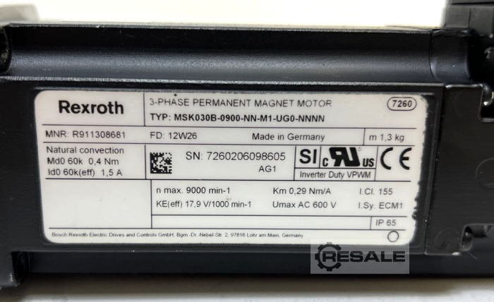 Rexroth, R911311555 + R911308681, MSK030B-0900-NN-M1-UG0-NNNN, Servo Motor Item condition: Used, in very good condition H1R6A12K34 2_CK You can find more engines - new and used - in our shop! International shipping costs on request!