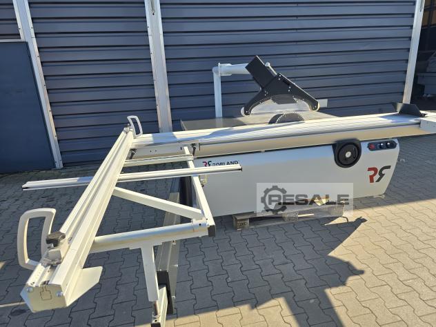 Scie à format coulissante Robland 320 cm Moteur principal 5.5KW Sous-découpeuse réglage manuel de haut en bas et d’angle de 0 à 45 3 vitesses de rotation La machine est en état de marche, elle remplit toujours bien ses fonctions