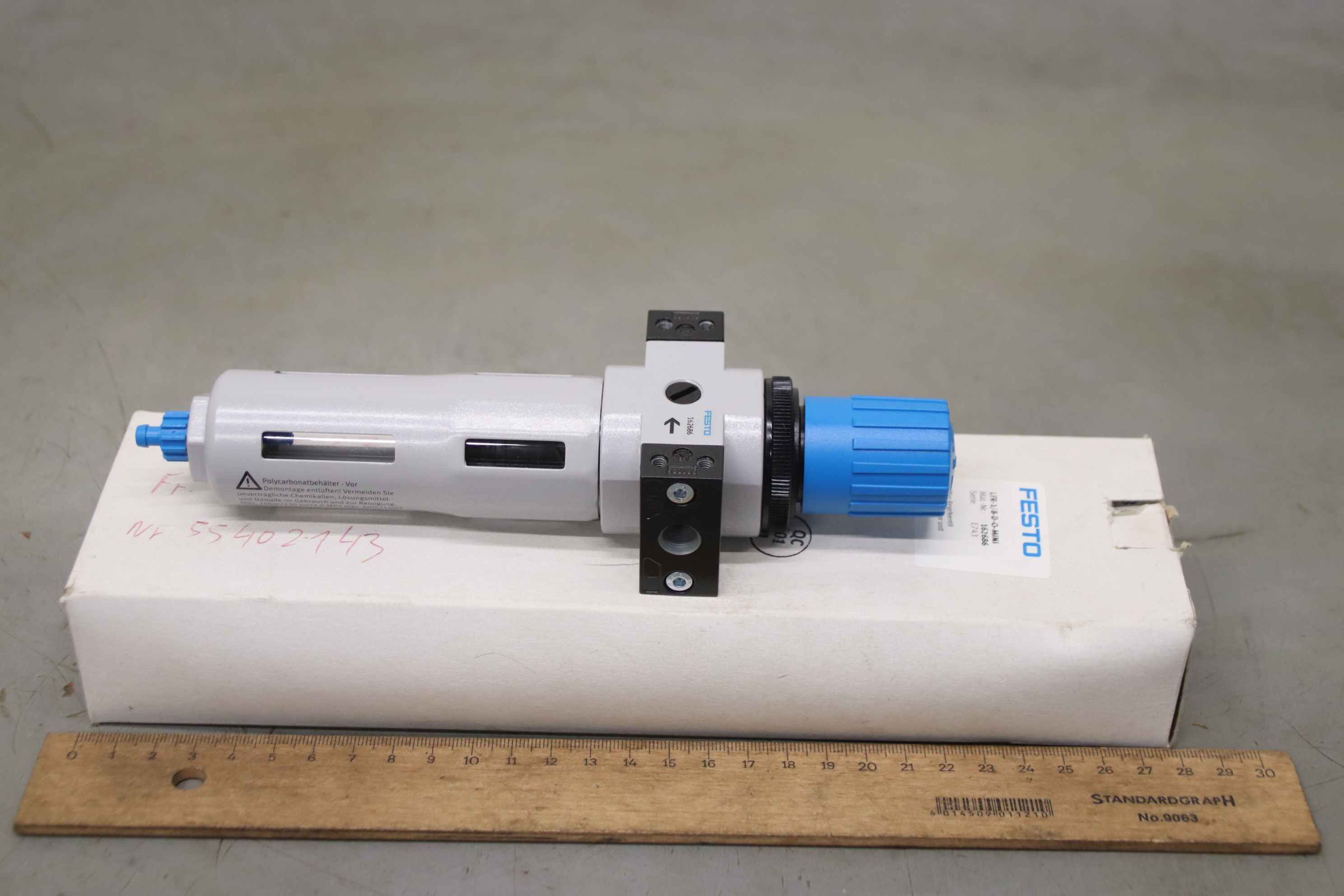 Filter control valve, on-off valve, maintenance unit, water separator, filter bowl, pneumatic filter, filter regulator, service unit combination, filter control valve-Manufacturer: Festo, maintenance unit with filter and control valve orig-Type: LFR-1/8-D-MINI-Pressure: max. 16/12 bar-Number: 1x filter control valve available-Price per piece-Weight: 0,5 kg/pc.