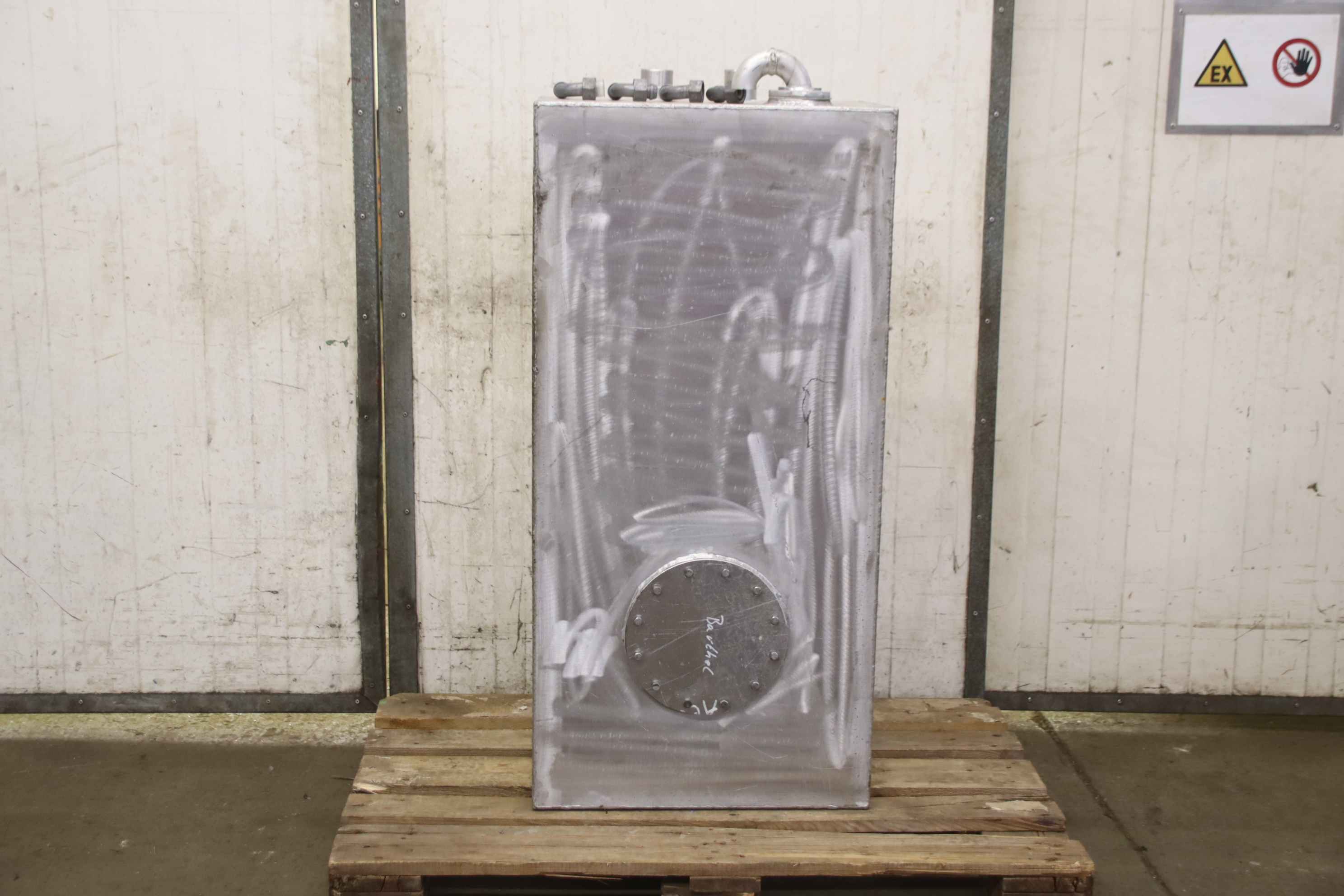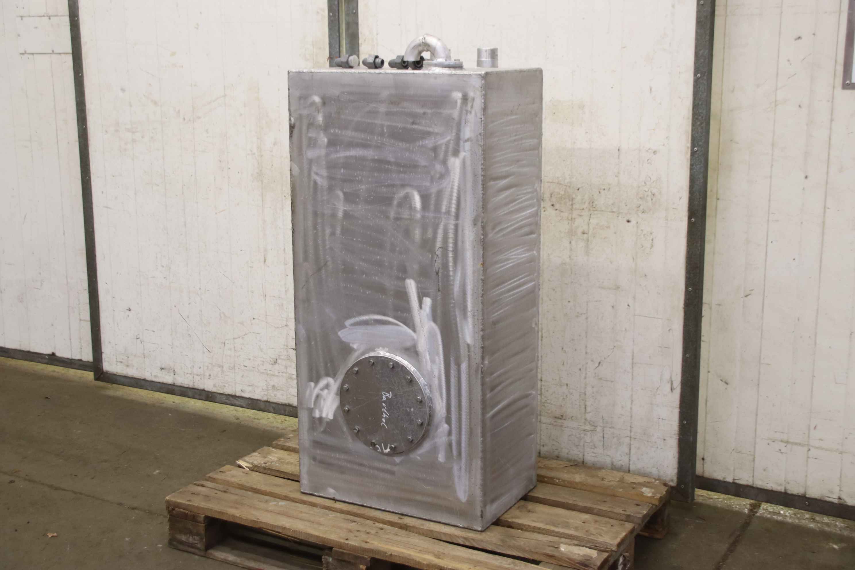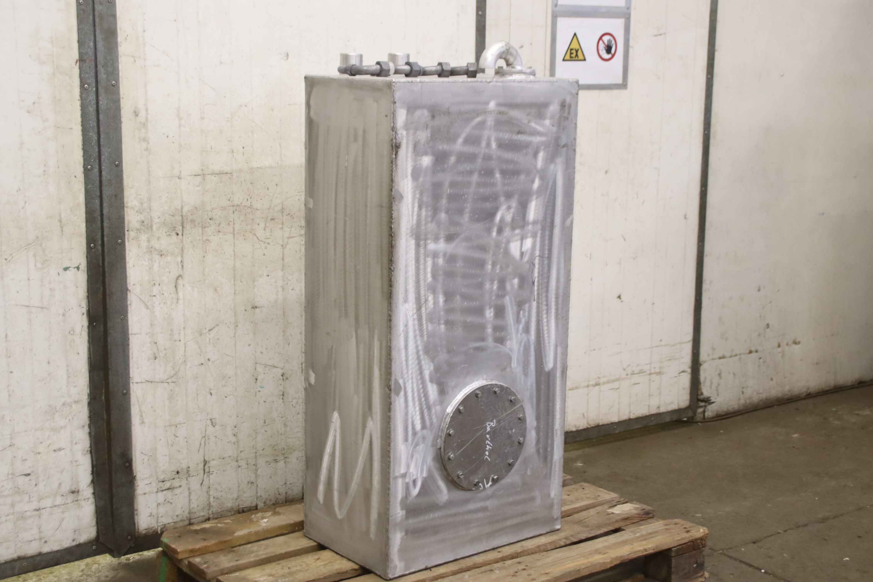 Hydraulic container, hydraulic tank, aluminum container for hydraulic pump, hydraulic unit -Hydraulic tank: Universal tank made of aluminum, unused -Tank capacity: approx. 230 l -Connections: see photos -Dimensions: 565/485/H1215 mm -Weight: 40 kg