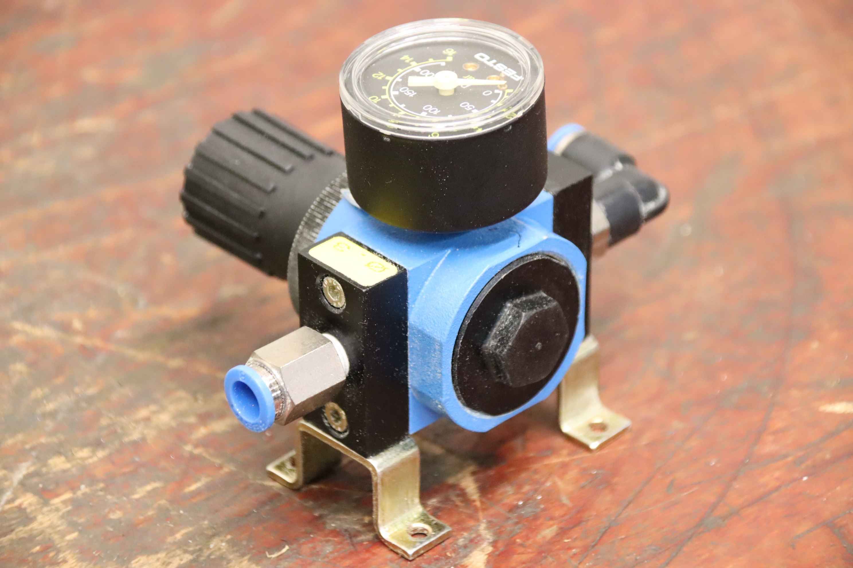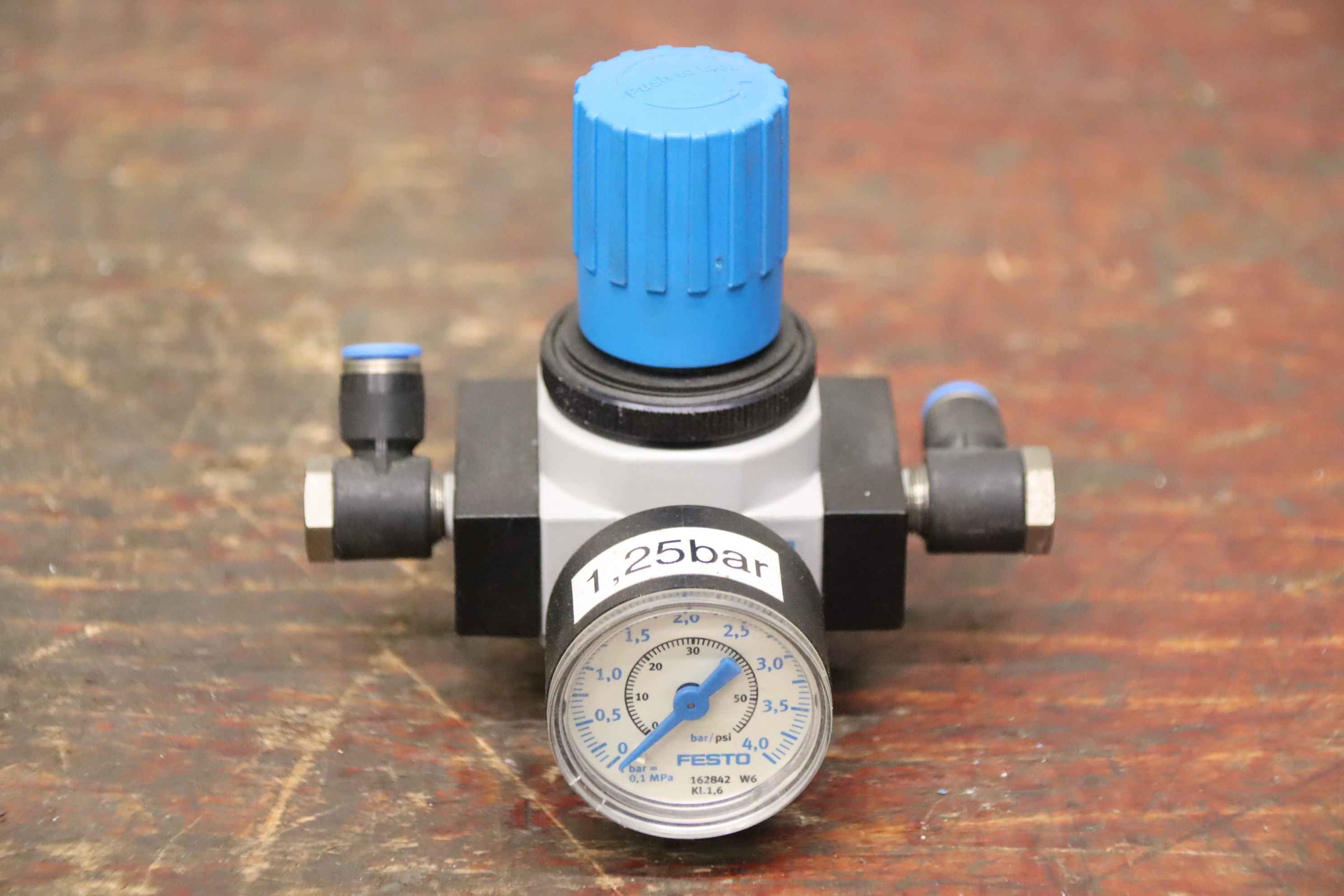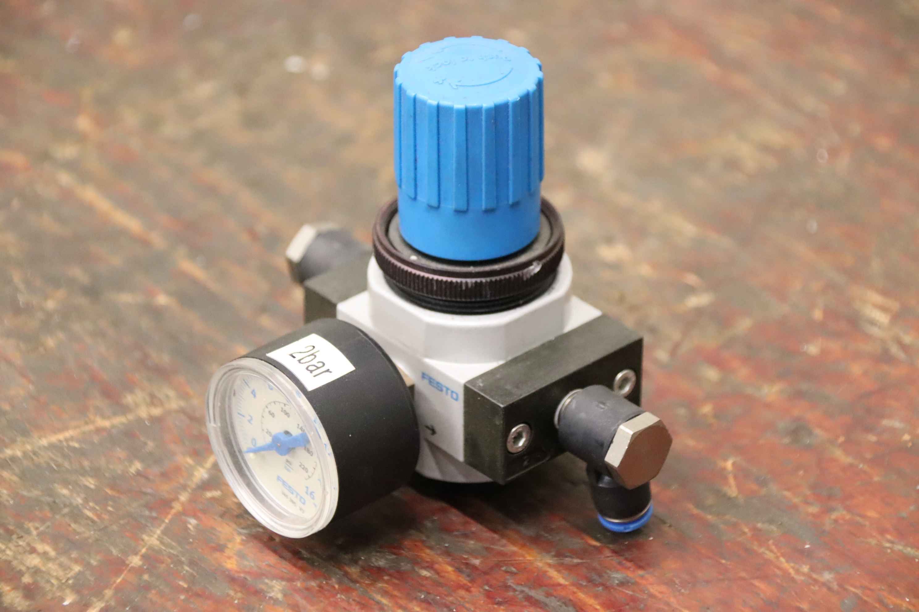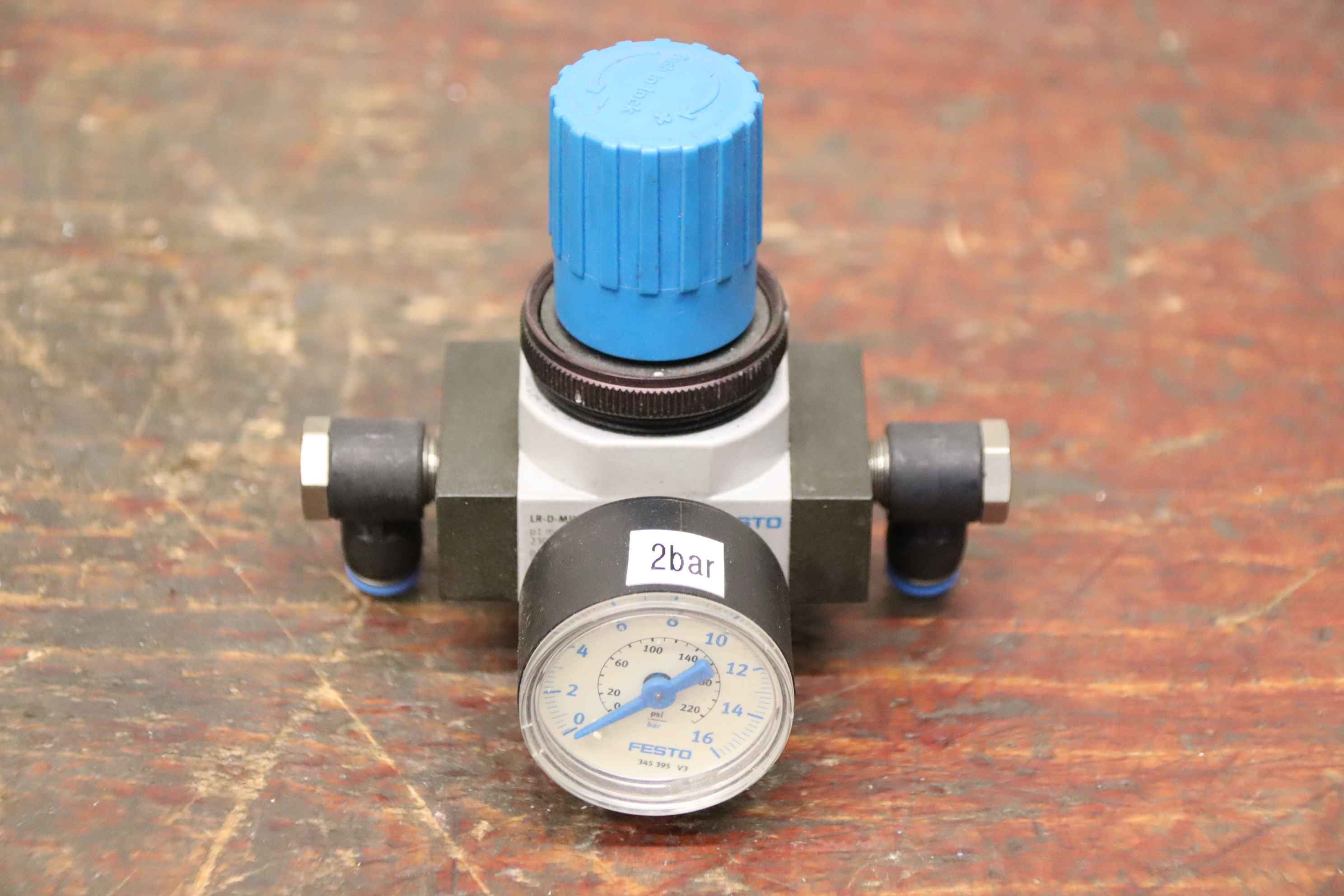 Pressure control valve, pressure control directional valve -Manufacturer: Festo, pressure regulator valve -Type: LR-D-7-I-MINI 192299 -Operating pressure: 0-4 bar -Pressure: max. 16/7 bar, see photo nameplate -Number: 3x valves available -Price: per piece -Dimensions: 110/80/H95 mm -Weight: 0.5 kg/piece