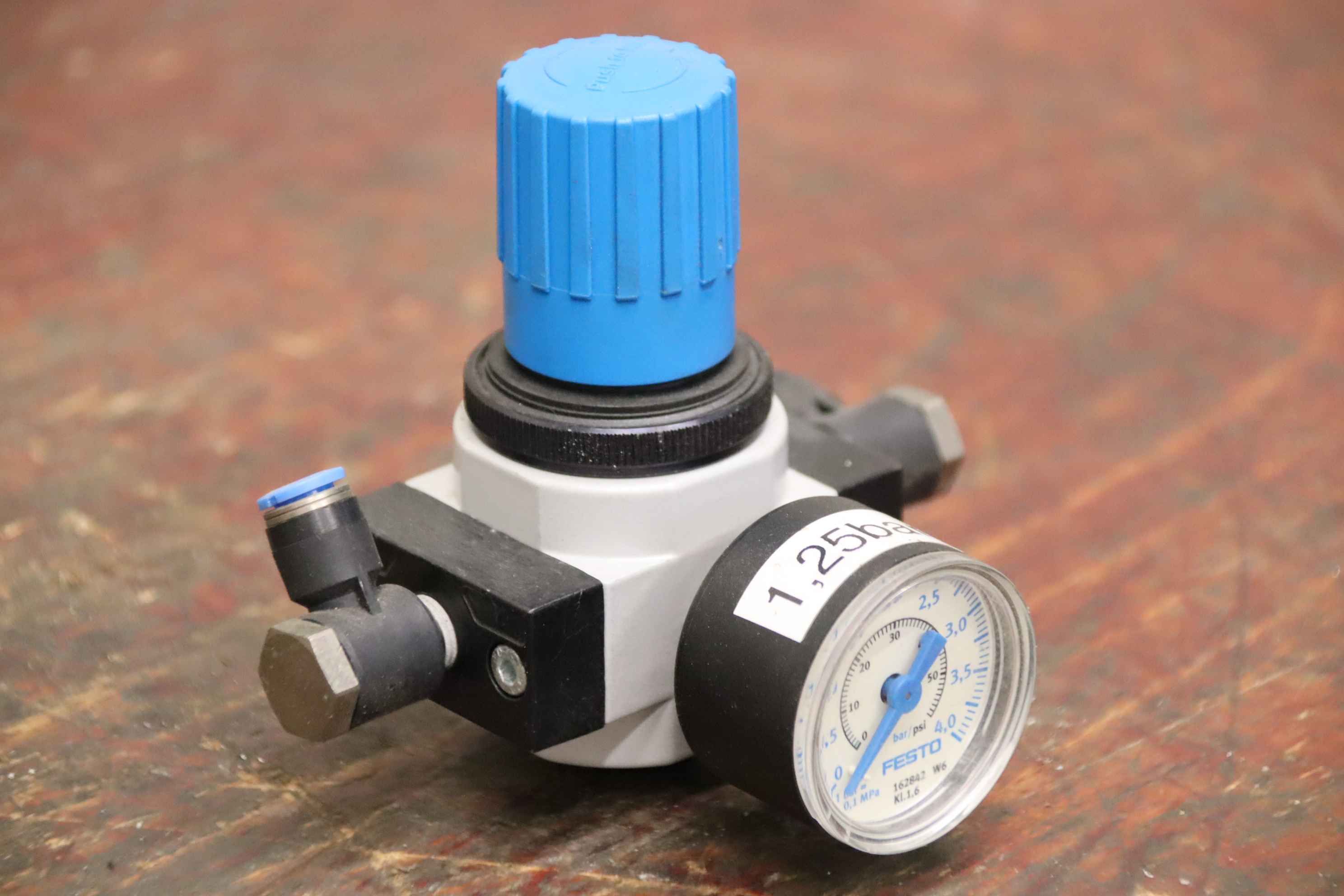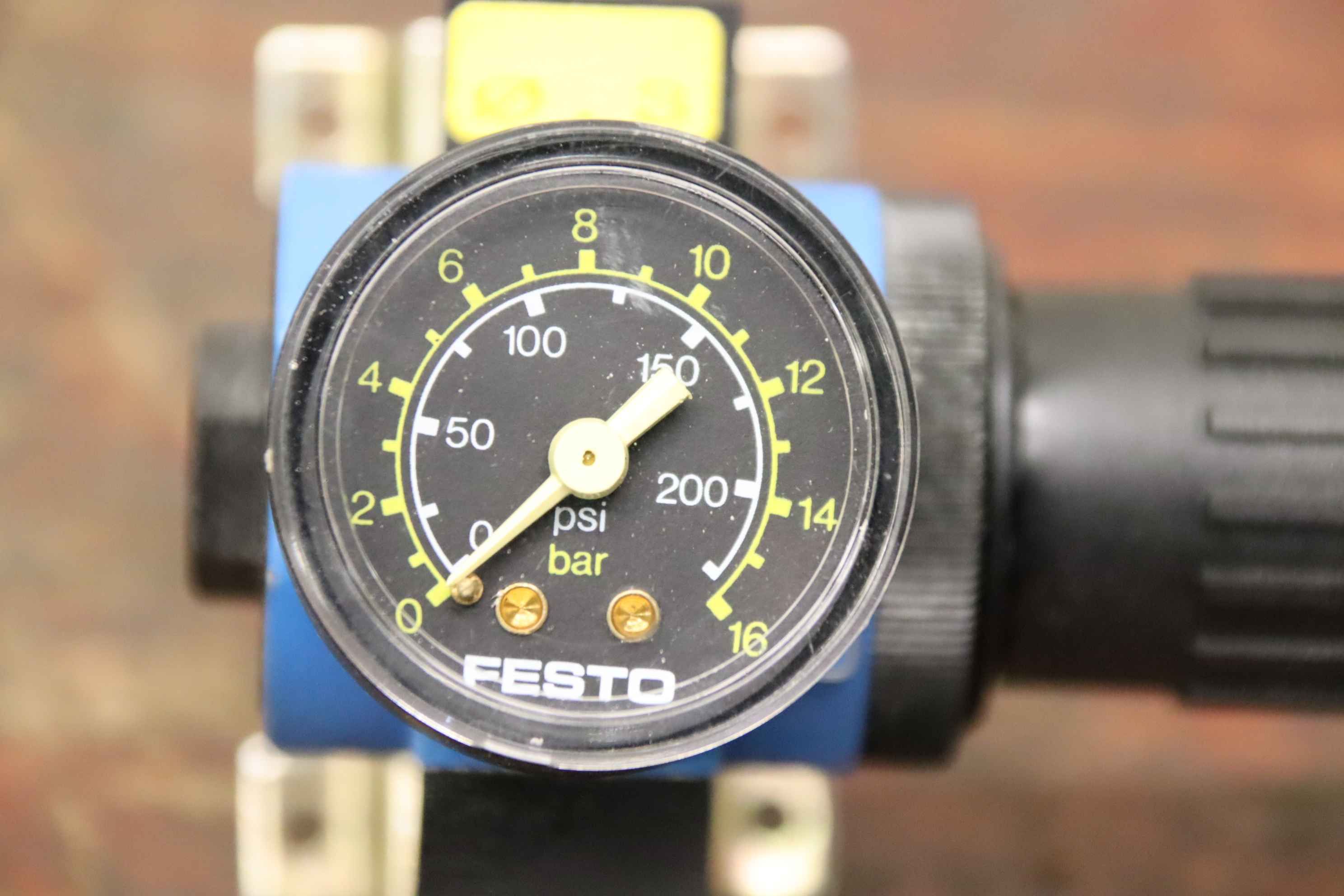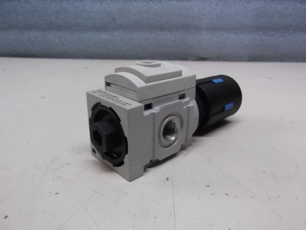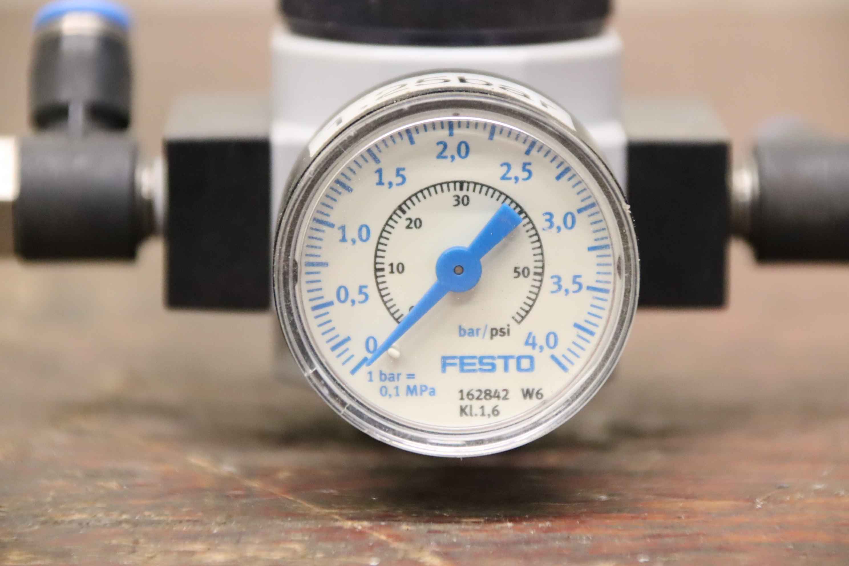 Pressure control valve, pressure control directional valve -Manufacturer: Festo, pressure regulator valve -Type: LR-D-7-I-MINI 192299 -Operating pressure: 0-4 bar -Pressure: max. 16/7 bar, see photo nameplate -Number: 3x valves available -Price: per piece -Dimensions: 110/80/H95 mm -Weight: 0.5 kg/piece