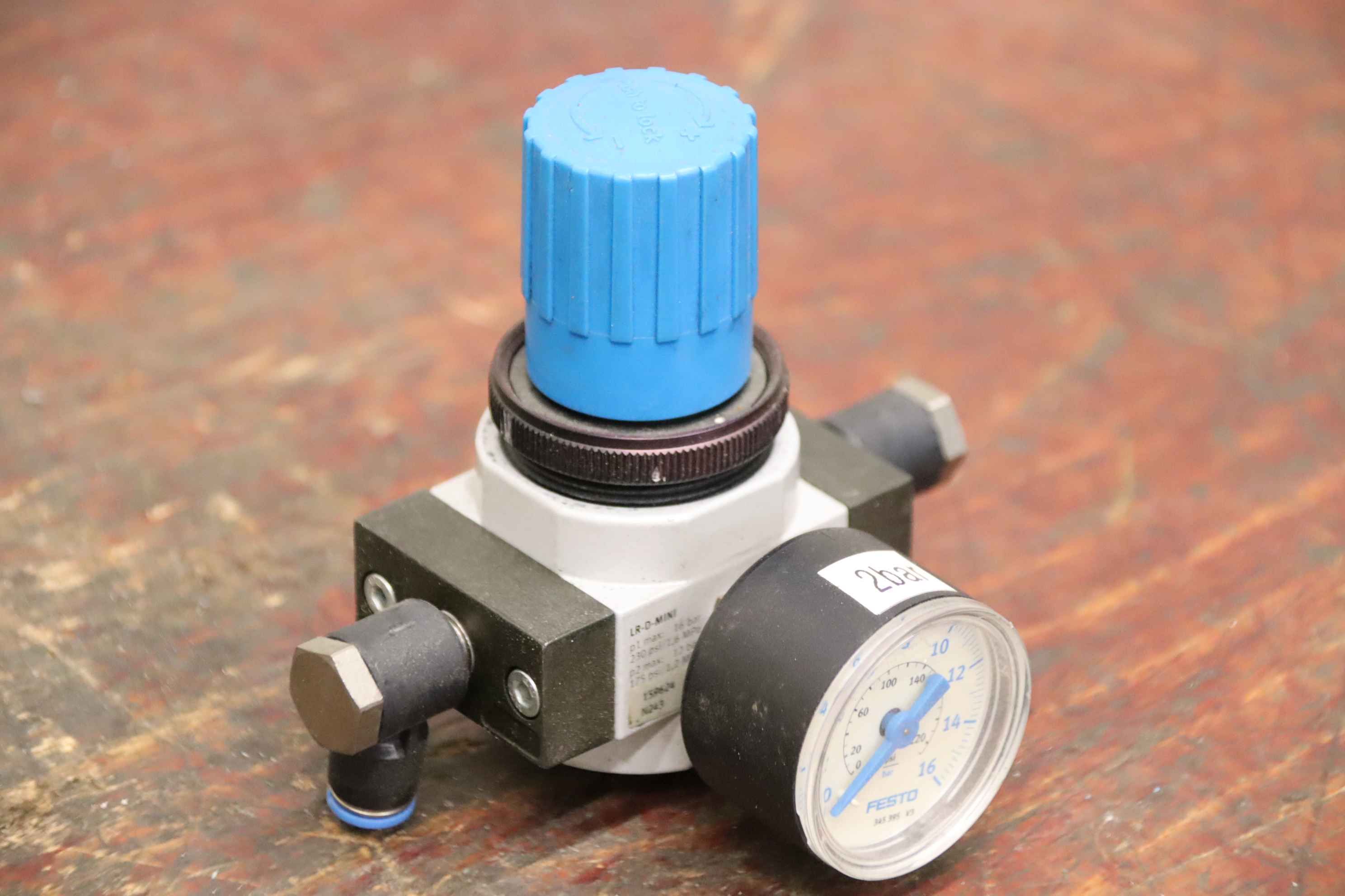 Pressure control valve, pressure control directional valve -Manufacturer: Festo, pressure regulator valve -Type: LR-D-MINI -Operating pressure: 0-16 bar -Pressure: max. 16/12 bar, see photo nameplate -Number: 3x valves available -Price: per piece -Dimensions: 110/80/H95 mm -Weight: 0.5 kg/piece