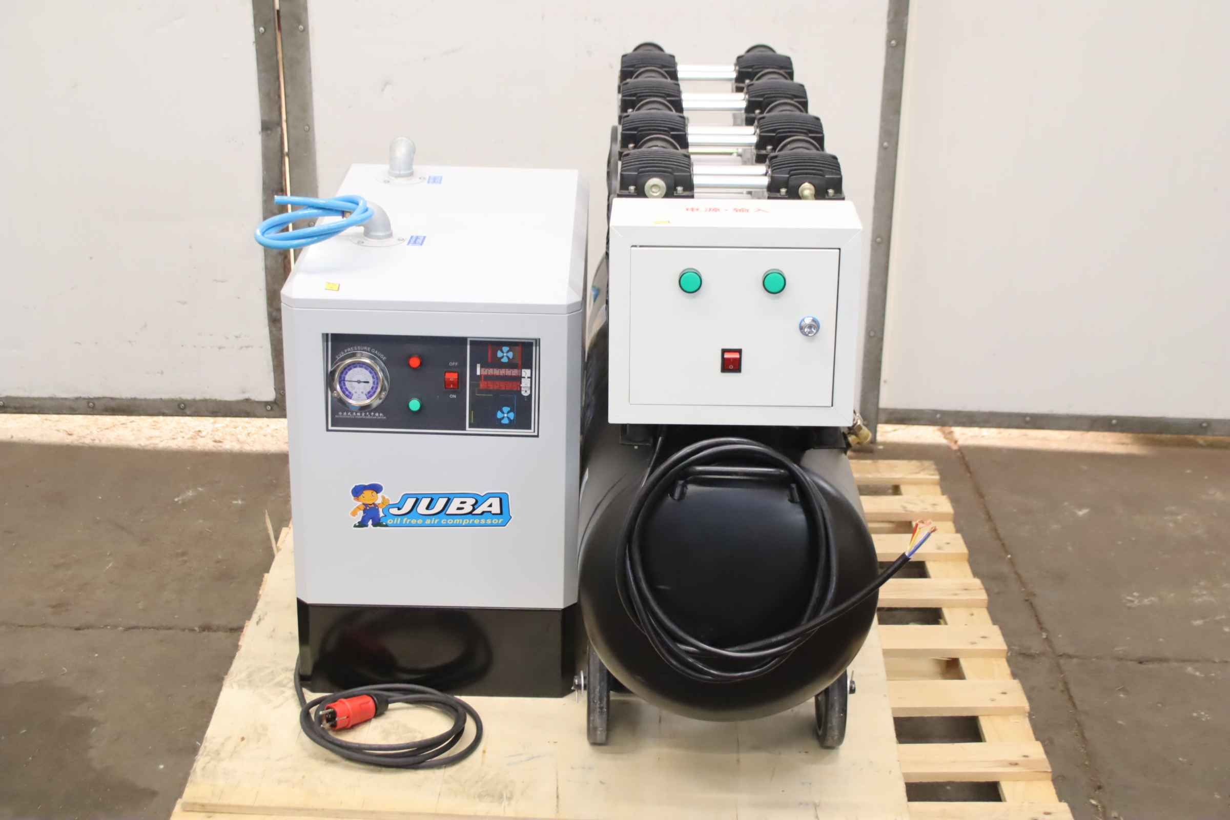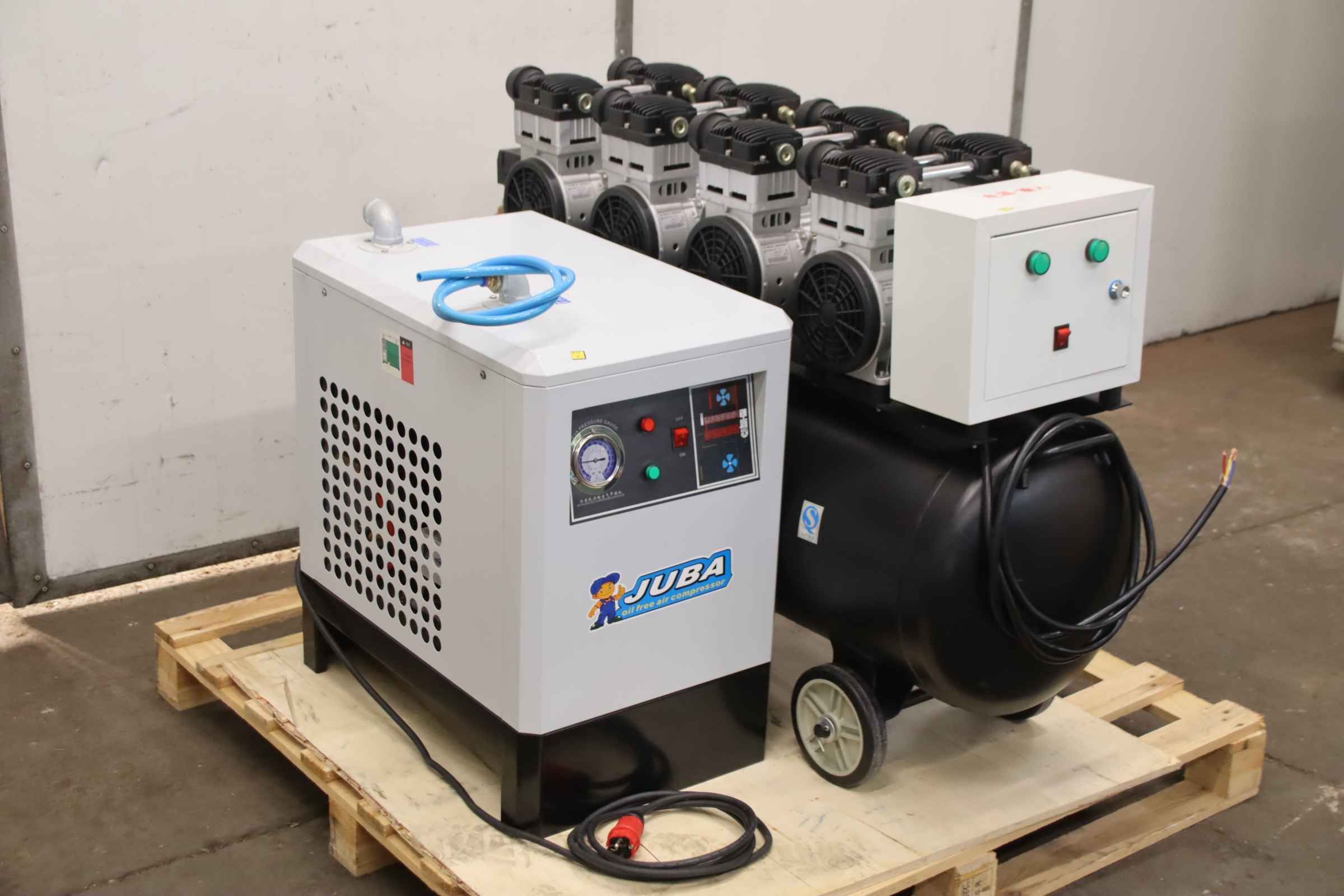 Screw compressor, compressor, compressed air unit, compressed air dryer, refrigeration dryer, dryer, compressed air refrigeration dryer -Manufacturer: JUBA, compressor with dryer -Compressor: Type JB 1500WX4 -Volume flow: 520 l/min -Engine power: 6 kW -Pressure: 7 bar -Tank capacity: 160 l -Dryer: Type JB-10AC 0.5 kW -Drying capacity 1.5 m³/min -Individual components: see photos -Transport dimensions: 1320/820/H830 mm -Total weight: 180 kg