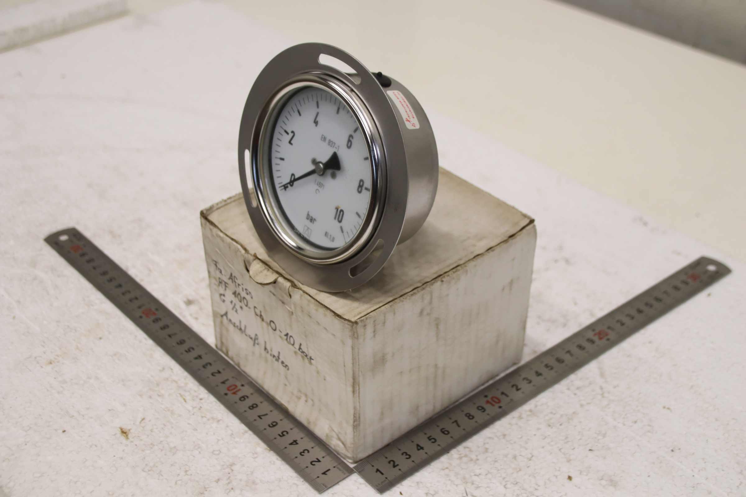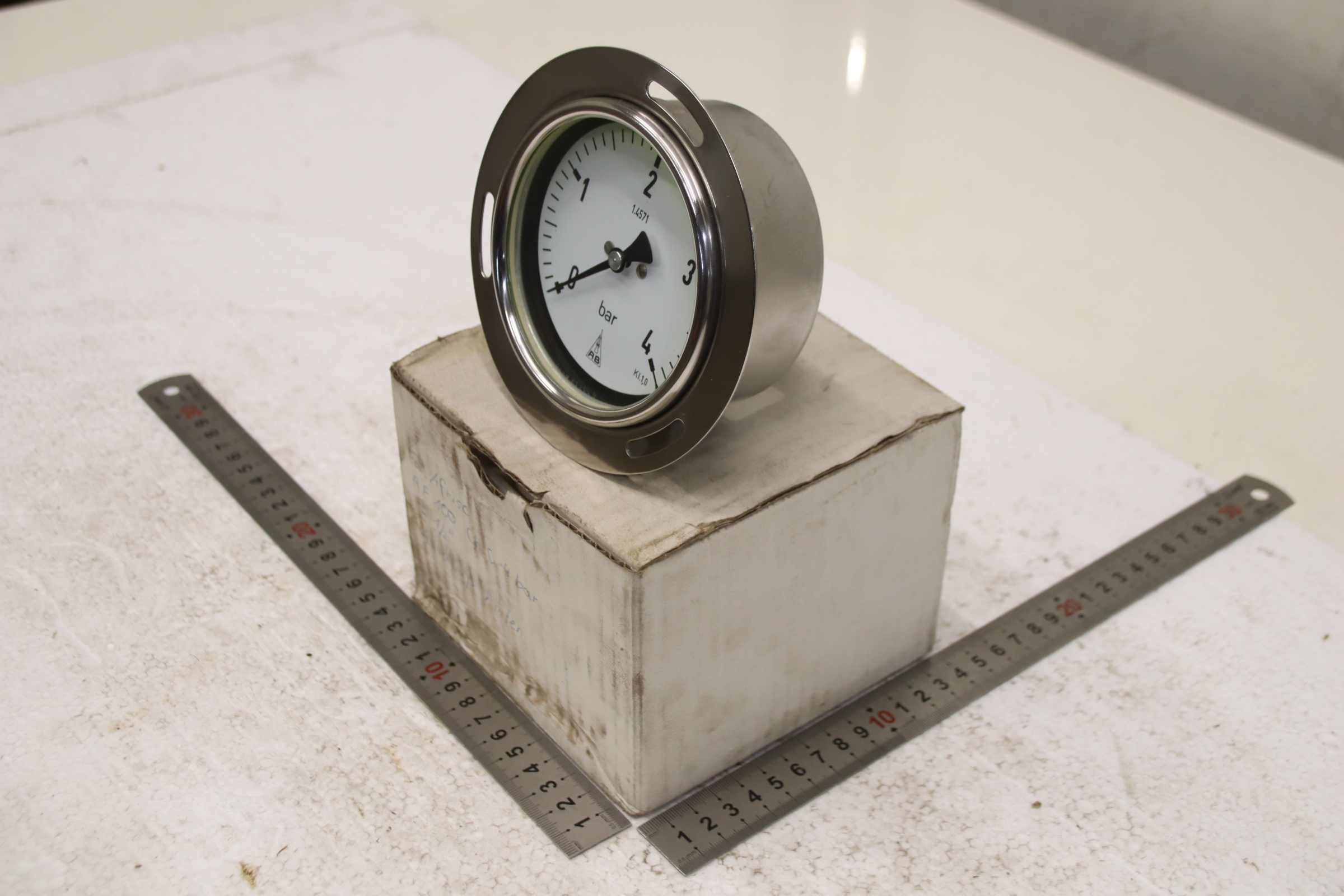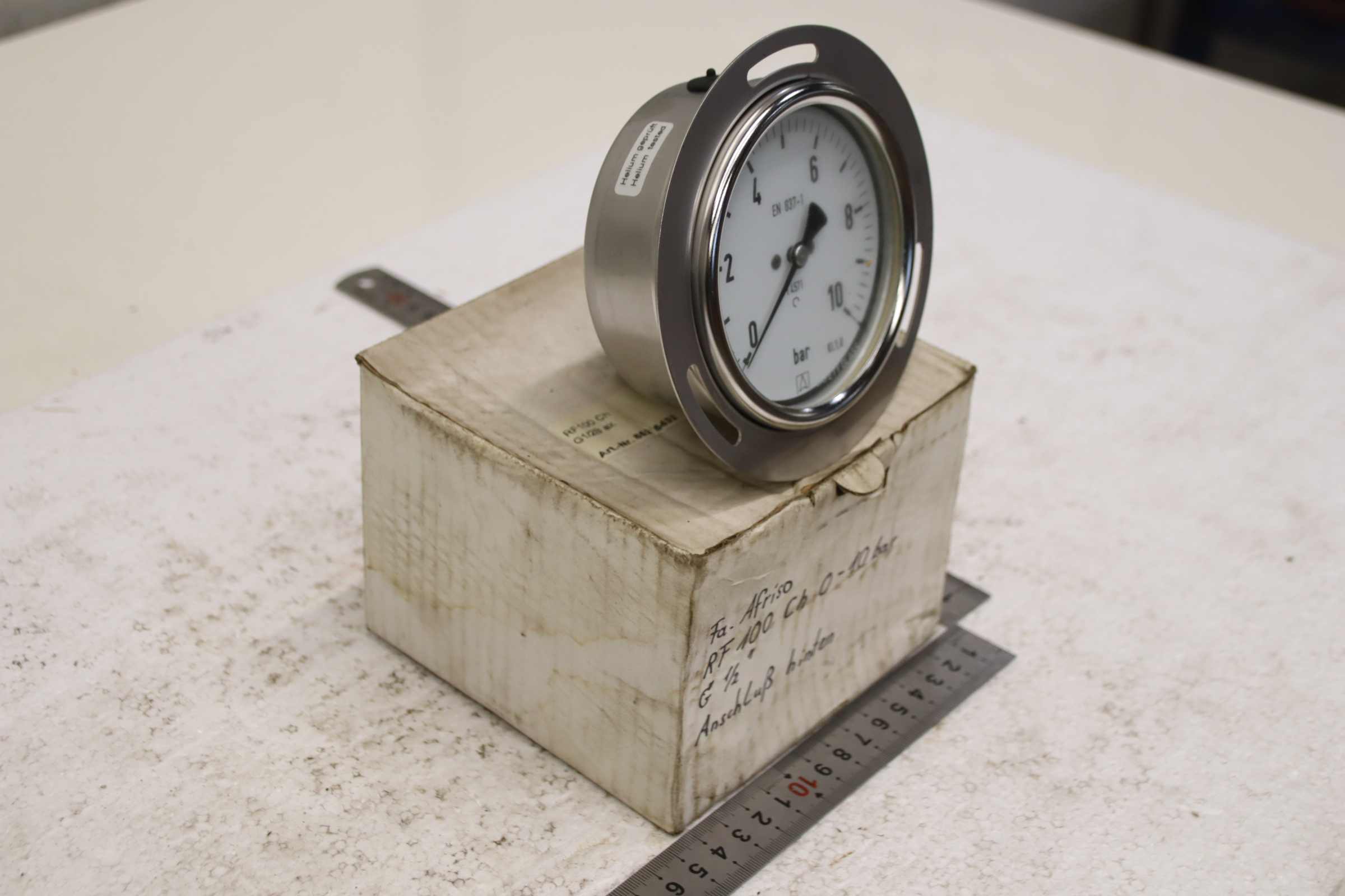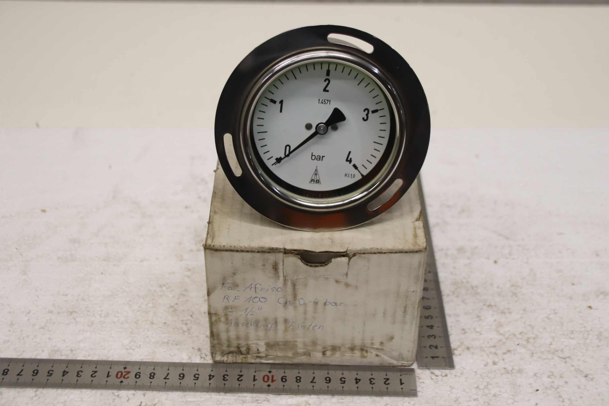 Manometer, test manometer, pressure gauge with Bourdon tube, pressure-temperature measuring technology, Bourdon tube manometer, pressure tester, pressure tester -Manufacturer: Afriso, Manometer 0-4 bar, unused, original packaging -Type: RF 100 Ch -Item No.: 85213432S -Screw connection: G 1/2B ax. -Quantity: 1x pressure gauge available -Cardboard dimensions: 140/140/H115 mm -Weight: 0.7 kg
