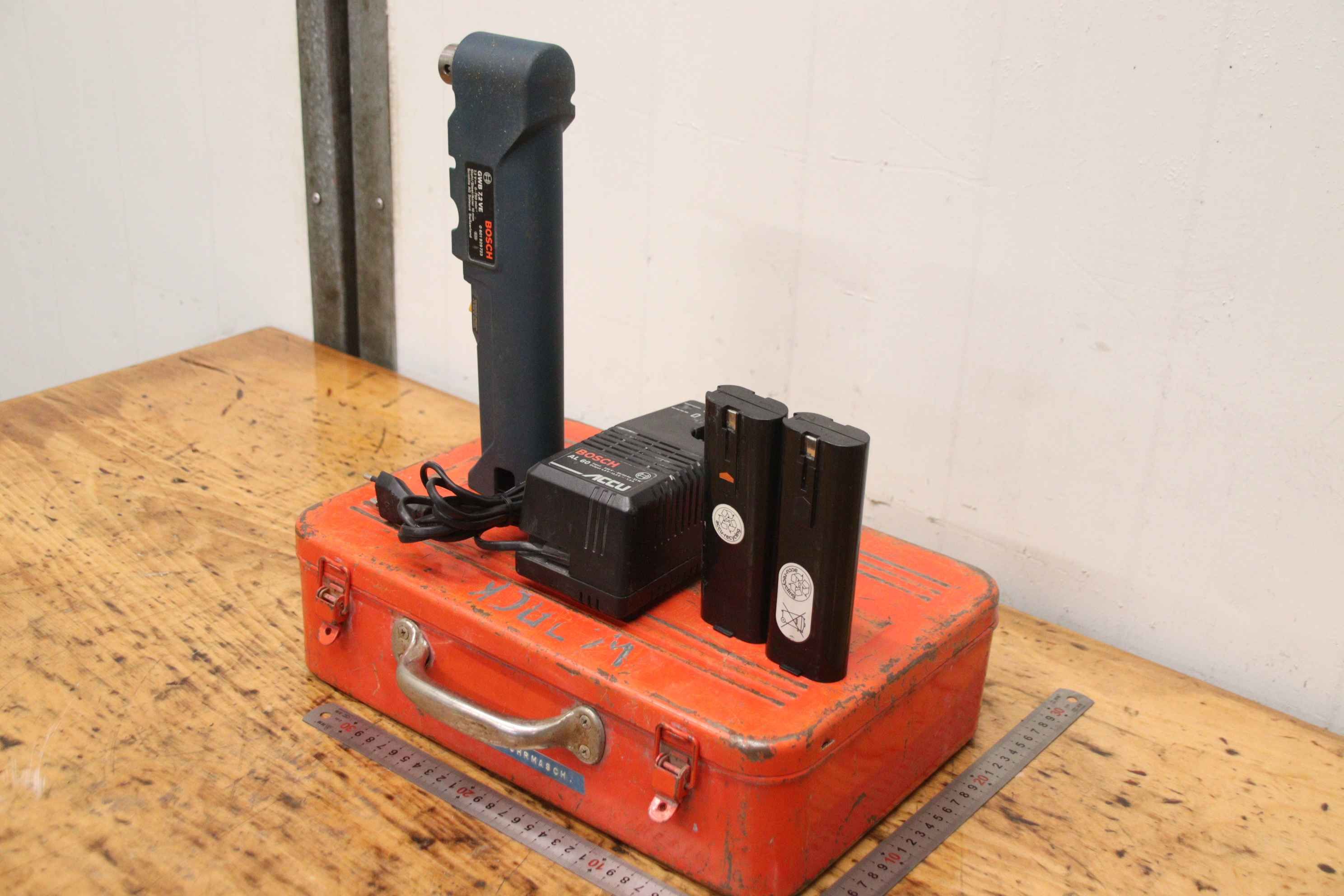 Cordless angle drill, cordless angle drill, -Manufacturer: Bosch, cordless drill type GWB 7.2 VE -incl.: charger -Quantity: 1x drill driver available -Price: per piece -Transport dimensions: 240/180/H240 mm -Weight: 6 kg