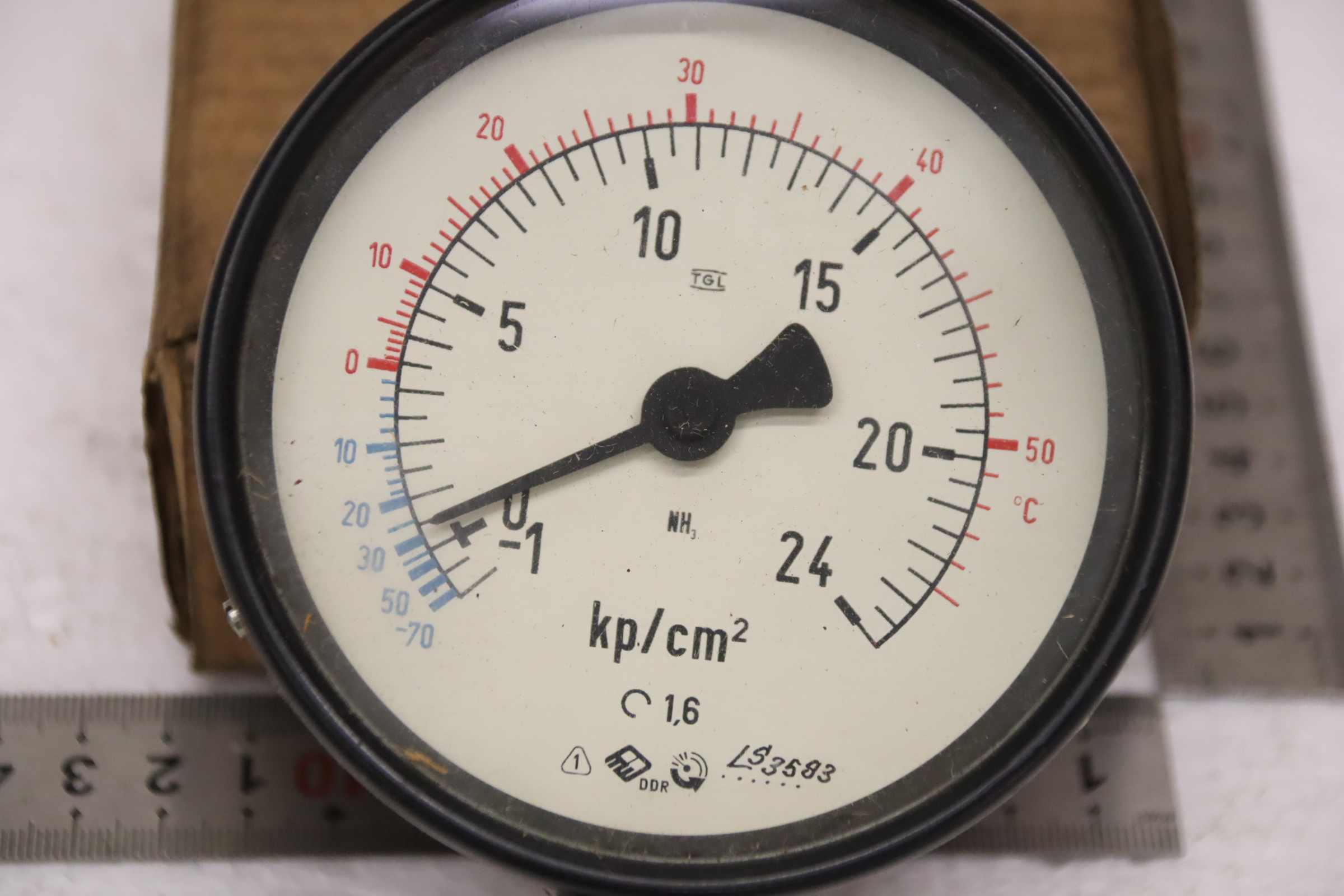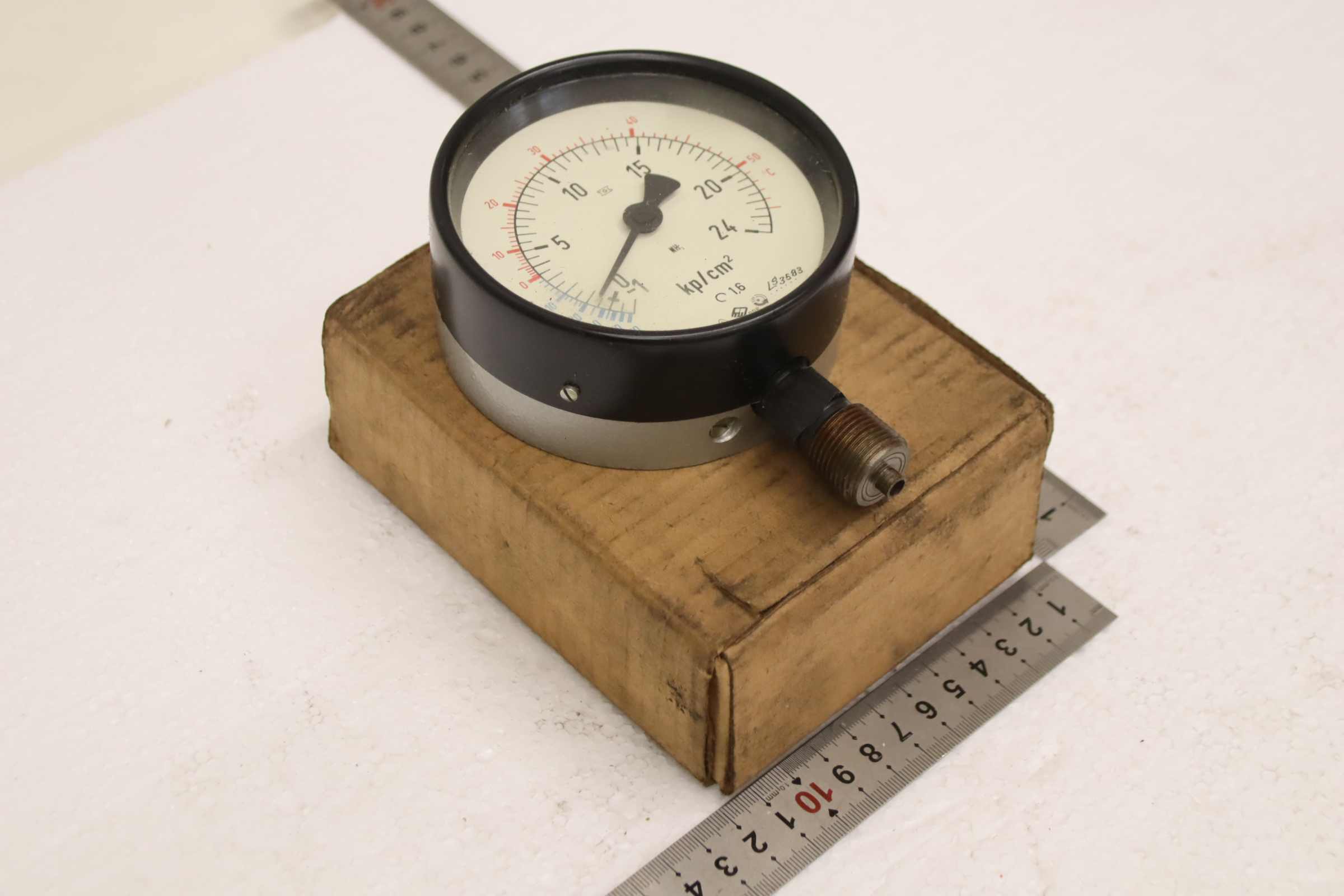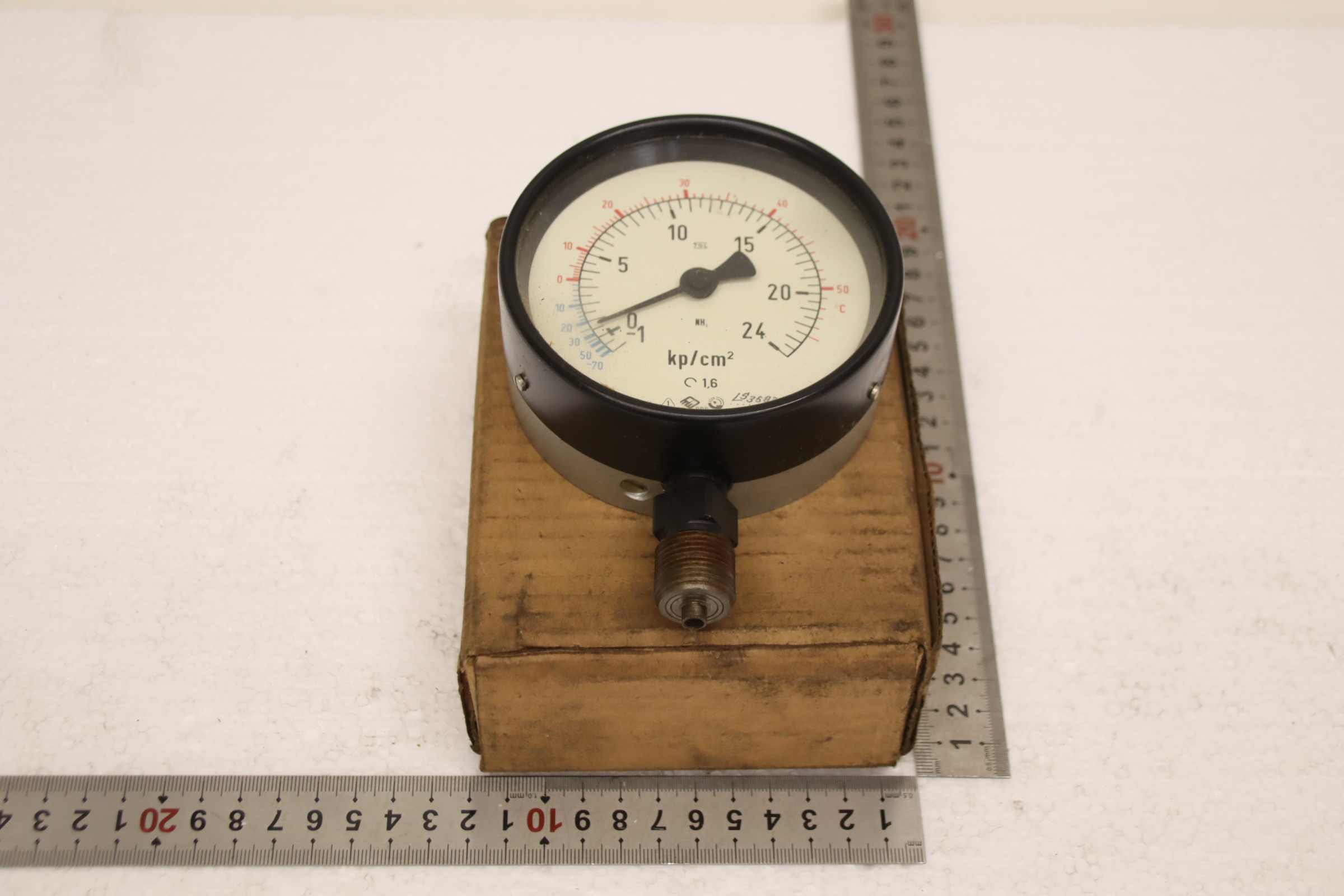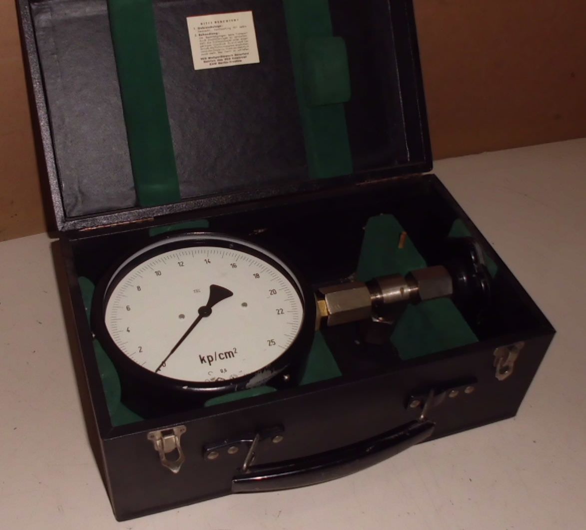 Manometer, test manometer, pressure gauge with Bourdon tube, pressure-temperature measuring technology, Bourdon tube manometer, pressure tester, pressure tester -Manufacturer: TGL, Manometer -1-0-24 bar, unused, original packaging -Type: 1/BS 64/2 100Ø M20x1.5 -1-0-24 kp/cm² -Quantity: 1x pressure gauge available -Cardboard dimensions: 150/120/H60 mm -Weight: 0.6 kg