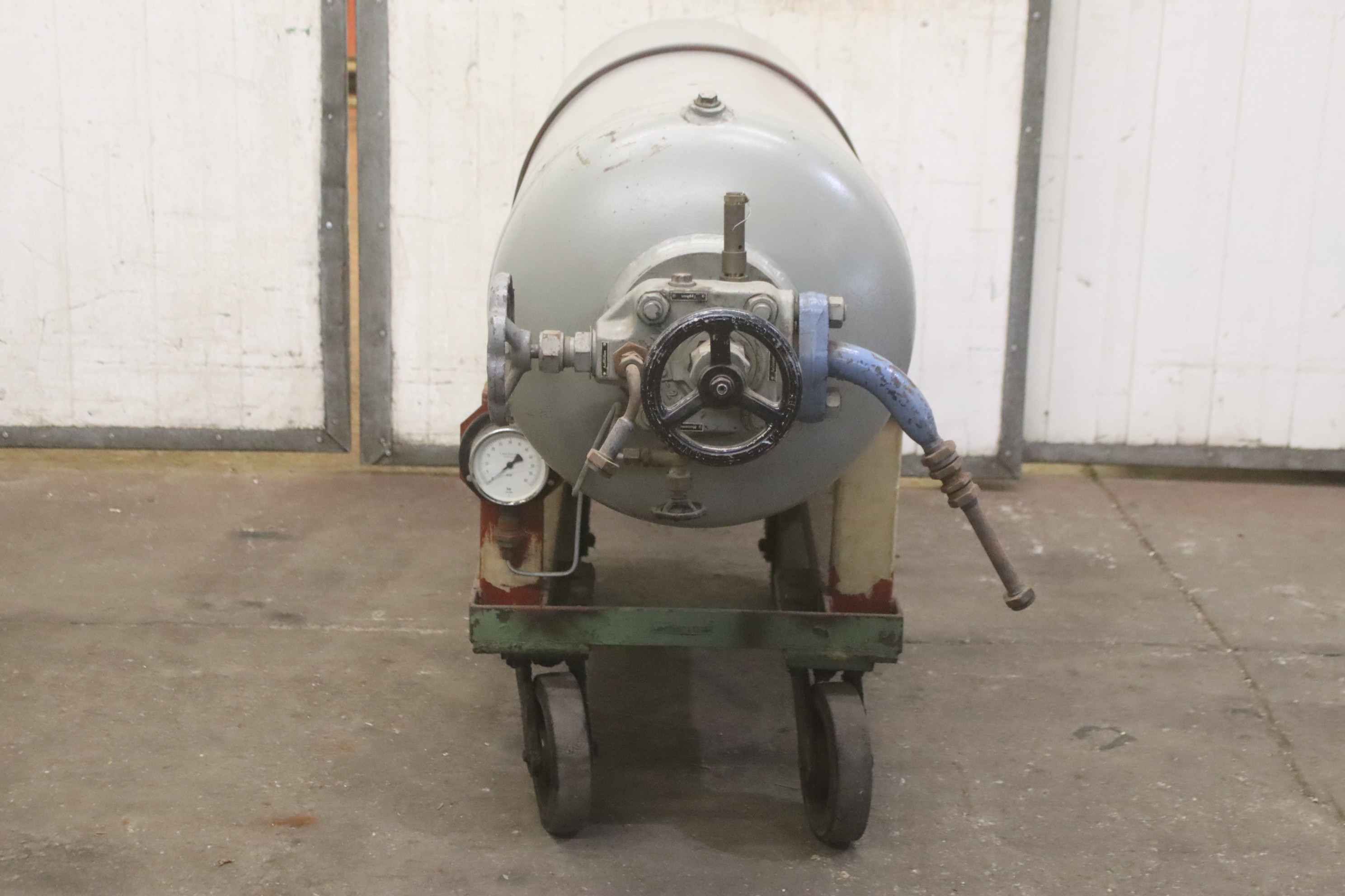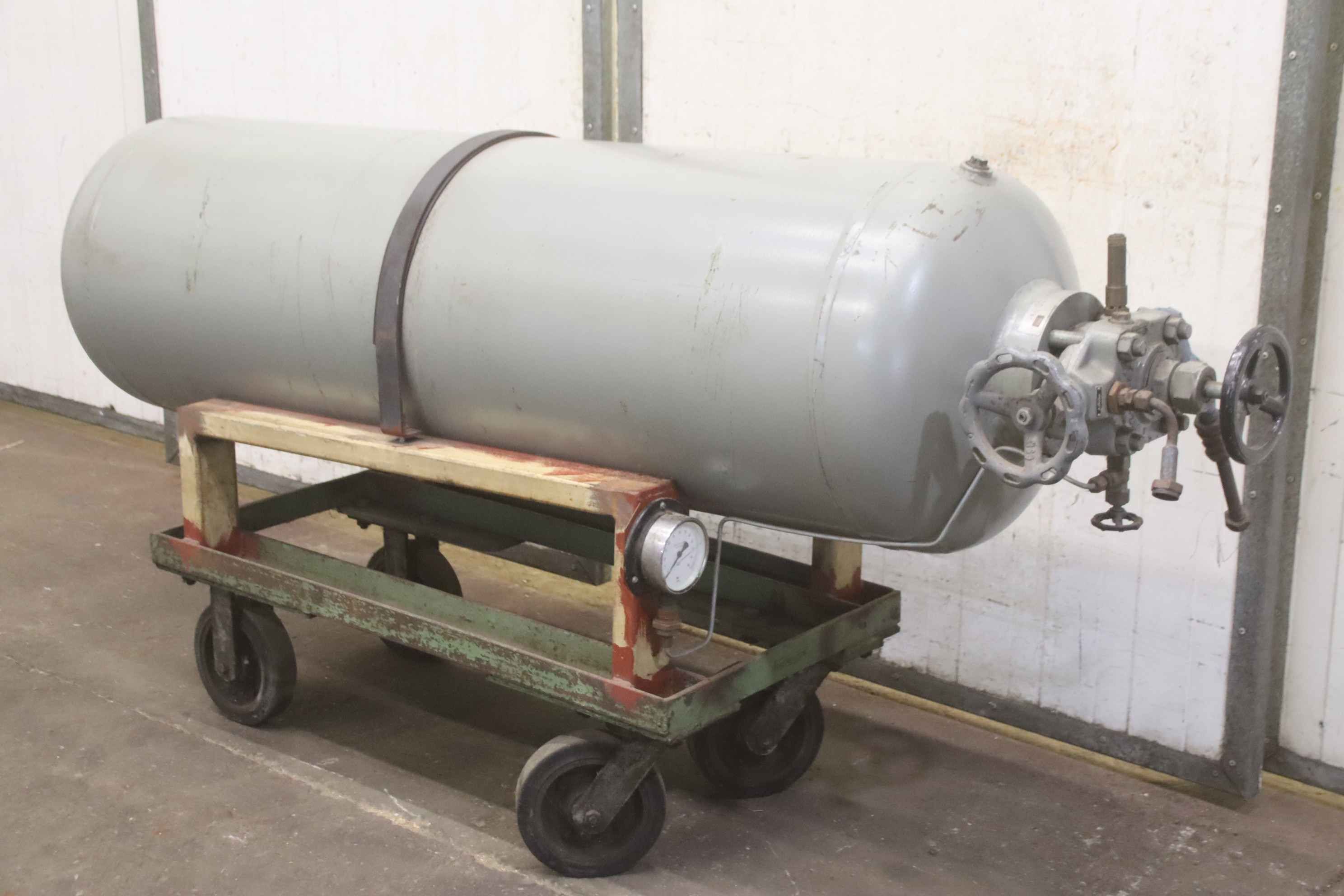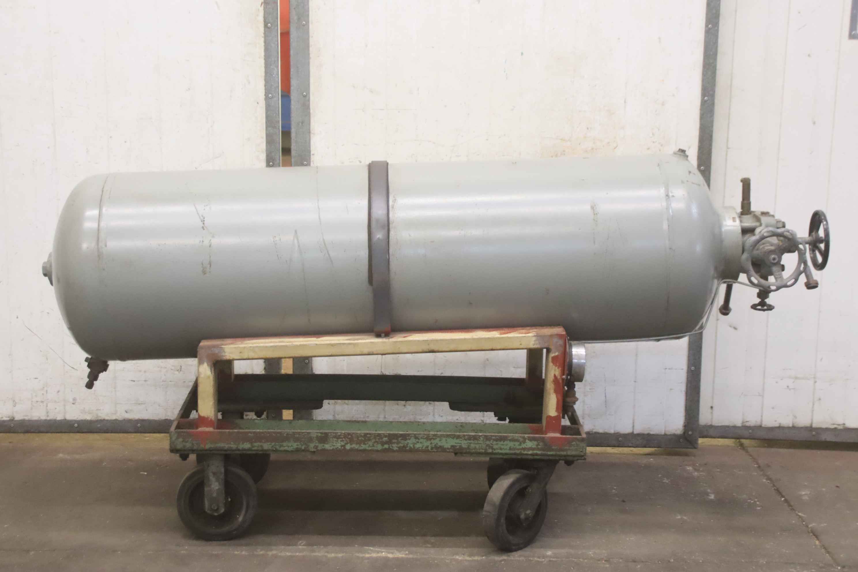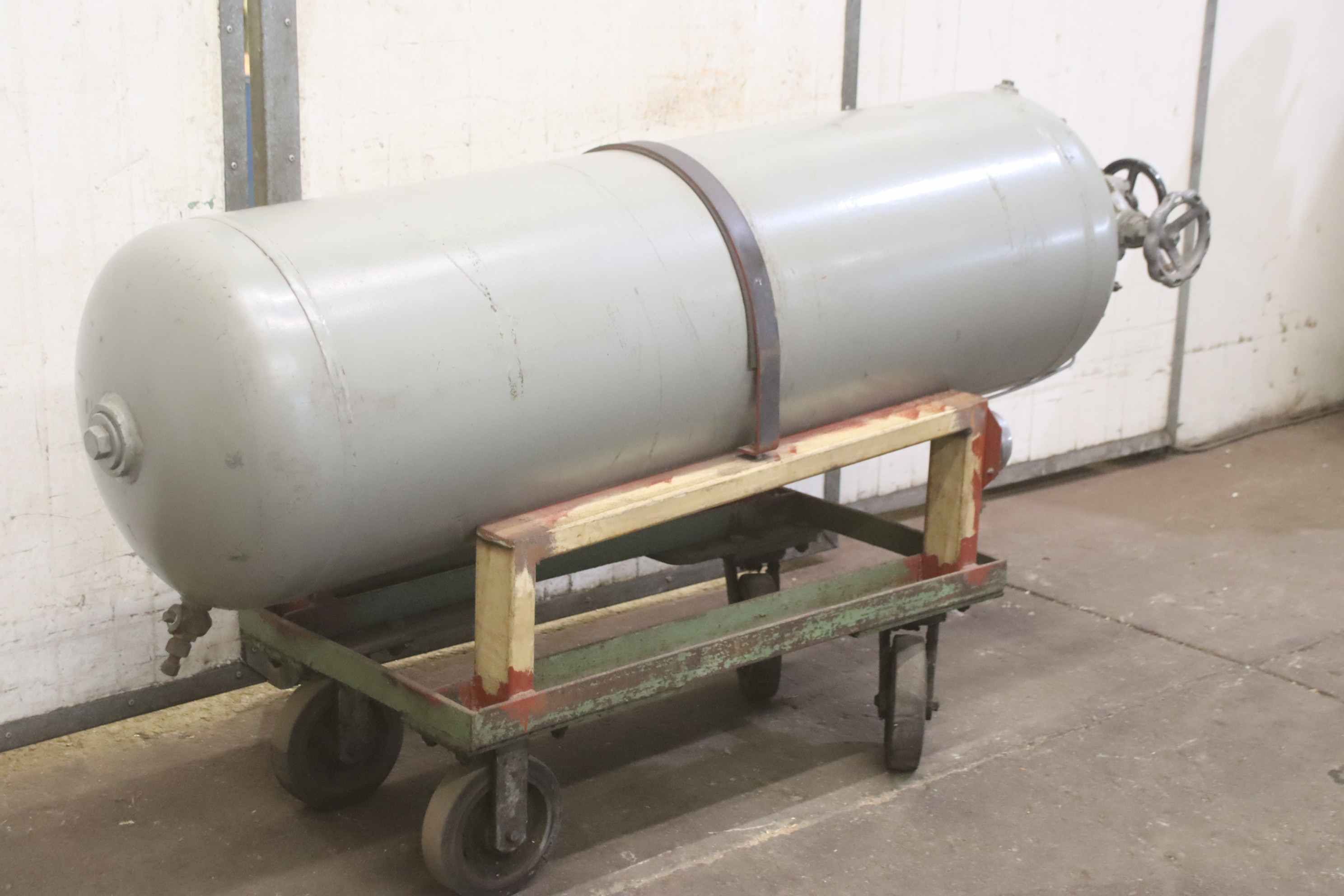 Compressed air tank, pressure vessel, pressure tank, compressed air reservoir, pressure vessel, compressor tank -Pressure vessel: Compressed air tank on a mobile chassis -Container capacity: 250 liters -Operating pressure: max. 30 bar -Position: lying on transport frame -Dimensions: 2000/550/H1010 mm -Weight: 363 kg
