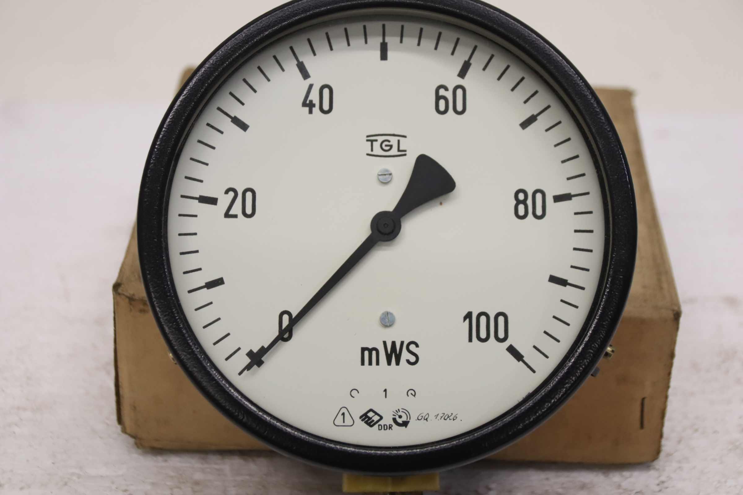 Manometer, test manometer, pressure gauge with Bourdon tube, pressure-temperature measuring technology, Bourdon tube manometer, pressure tester, pressure tester -Manufacturer: TGL, Manometer 0 - 10 bar, unused, original packaging -Type: 1/BM 20/2 160Ø 0-100 mWs -Number: 8x pressure gauges available -Price: per piece -Cardboard dimensions: 200/180/H70 mm -Weight: 1 kg/pc.