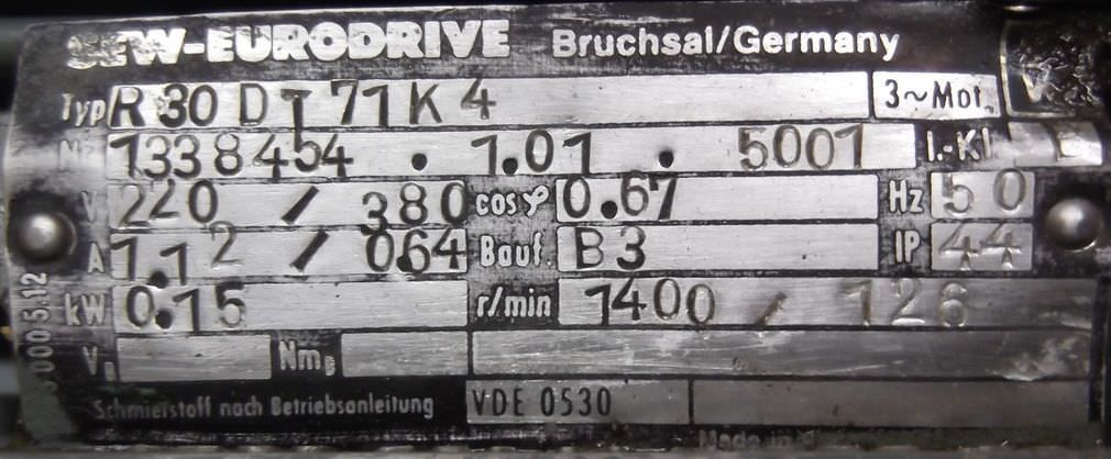 Gear motor, electric motor-Speed: 126 rpm-Power: 0.15 kW-Construction: B3-Diameter shaft: Ø 16 mm-Protection class: IP 44-Number: 1x motors available-Price: per piece-Dimensions: 300/190/H150 mm-Weight: 9.7 kg