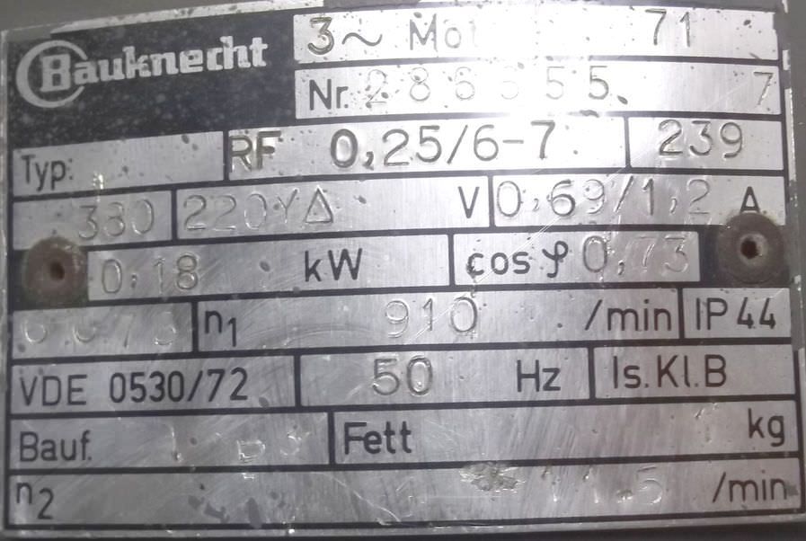 Gear motor, electric motor-Speed: 32/65 rpm-Power: 0.2/0.4 kW-Construction: B5-Diameter shaft: Ø 25 mm-Brake: 24 V-Protection class: IP 65-Price: per piece-Number: 5x available-Dimensions: 560/250/H220 mm-Weight: 32 kg