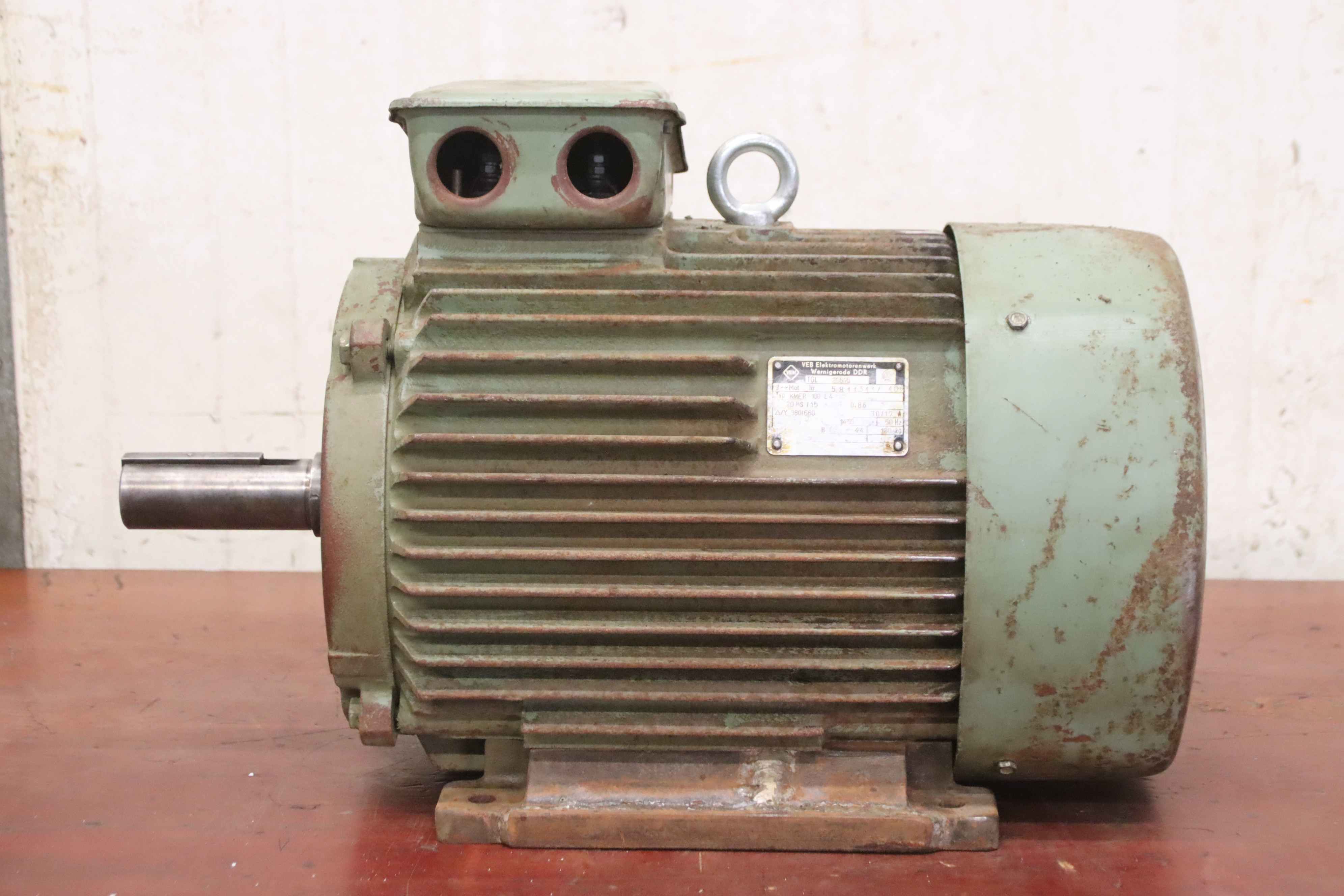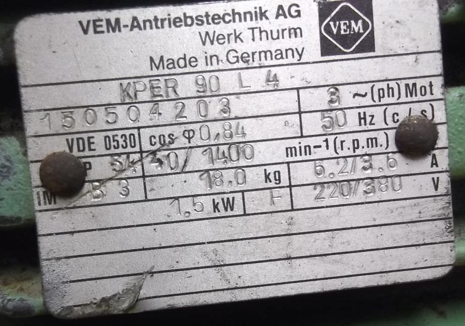 Three-phase motor, electric motor -Manufacturer: VEM, electric motor type KMER 160 L4 -Power: 15 kW -Speed: 1455 rpm -Voltage: 380/660 volts -Shaft: Ø 42 x 110 mm -Protection rating: IP44 -Design: B3 -Dimensions: 600/320/H395 mm -Weight: 123 kg