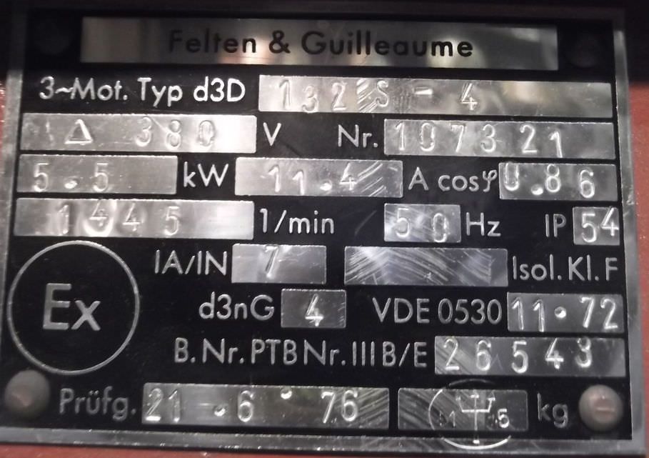 Electric motor, three-phase motor-Power: 5.5 kW-Speed: 1445 rpm-Shaft: Ø 38 mm-Construction: B3-Protection class: IP 54-Price: per piece-Number: 2x available-Dimensions: 450/265/H410 mm-Weight: 79 kg