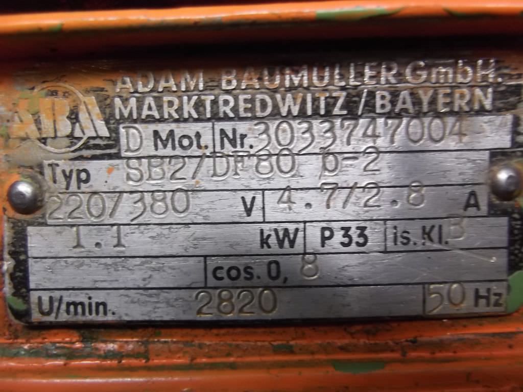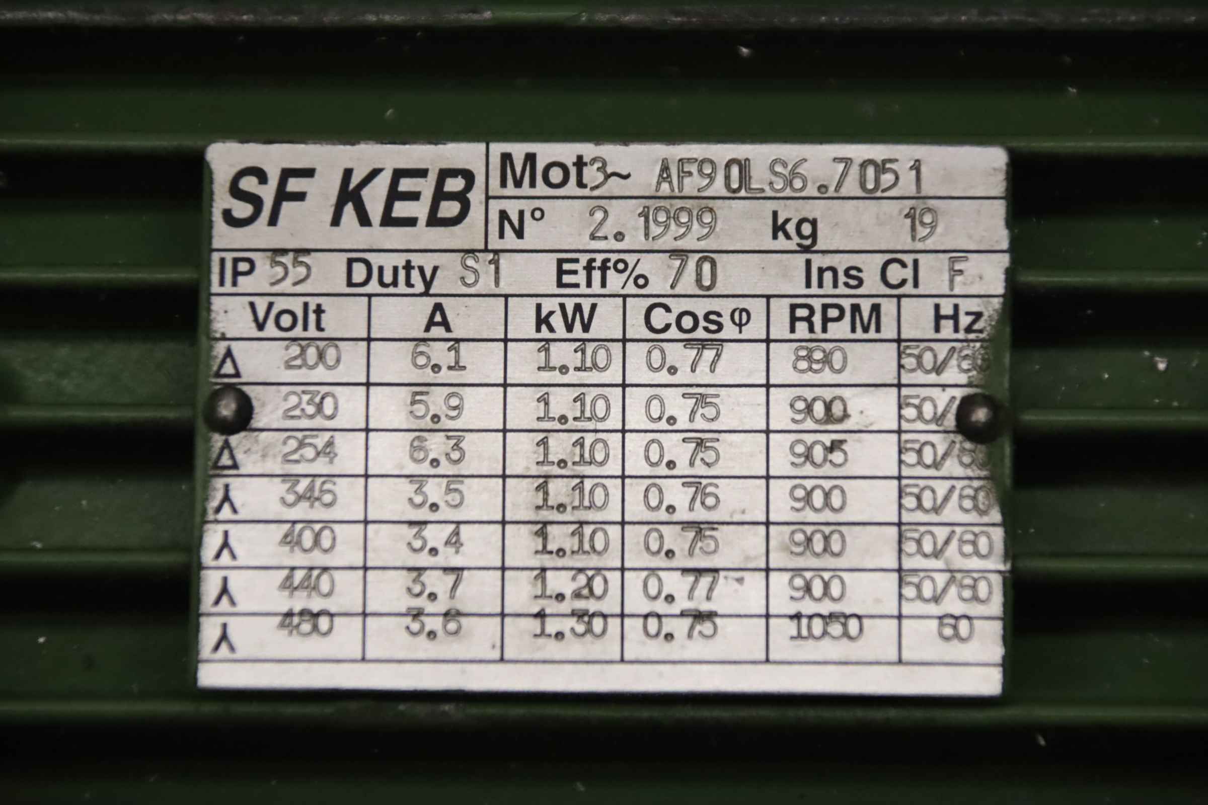 three-phase motor, electric motor -Manufacturer: SF KEB, electric motor type AF90LS6.7051 -Power: 1.1 kW -Speed: 900 rpm -Shaft: Ø 24 x 50 mm -Protection class: IP55 -Design: B14 -Dimensions: 380/210/H176 mm -Weight: 20 kg.