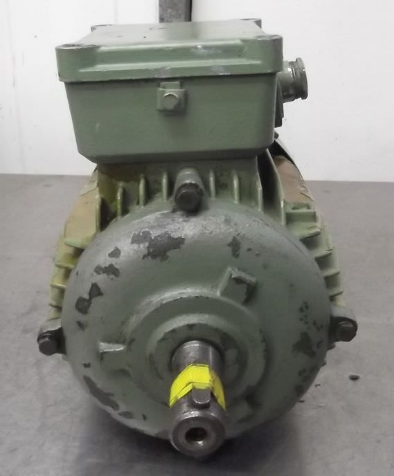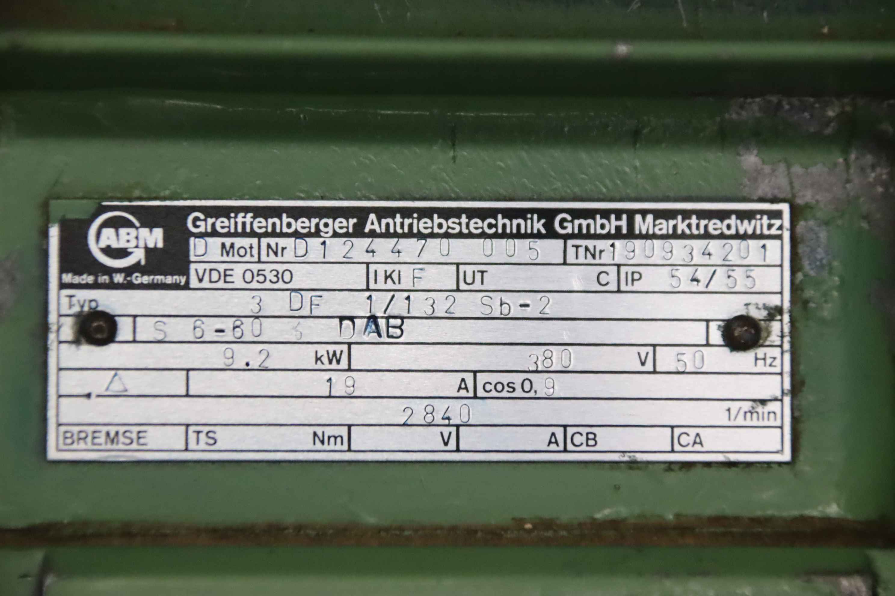 Electric motor, three-phase motor-Manufacturer: ABM Greiffenberger, electric motor type 3 DF 1/132 Sb-2-Power: 9.2 kW-Speed: 2840 rpm-Shaft: Ø 38 x 80 mm-Design: B5-Protection class: IP 54/55-Dimensions: 450/300/H250 mm-Weight: 43 kg