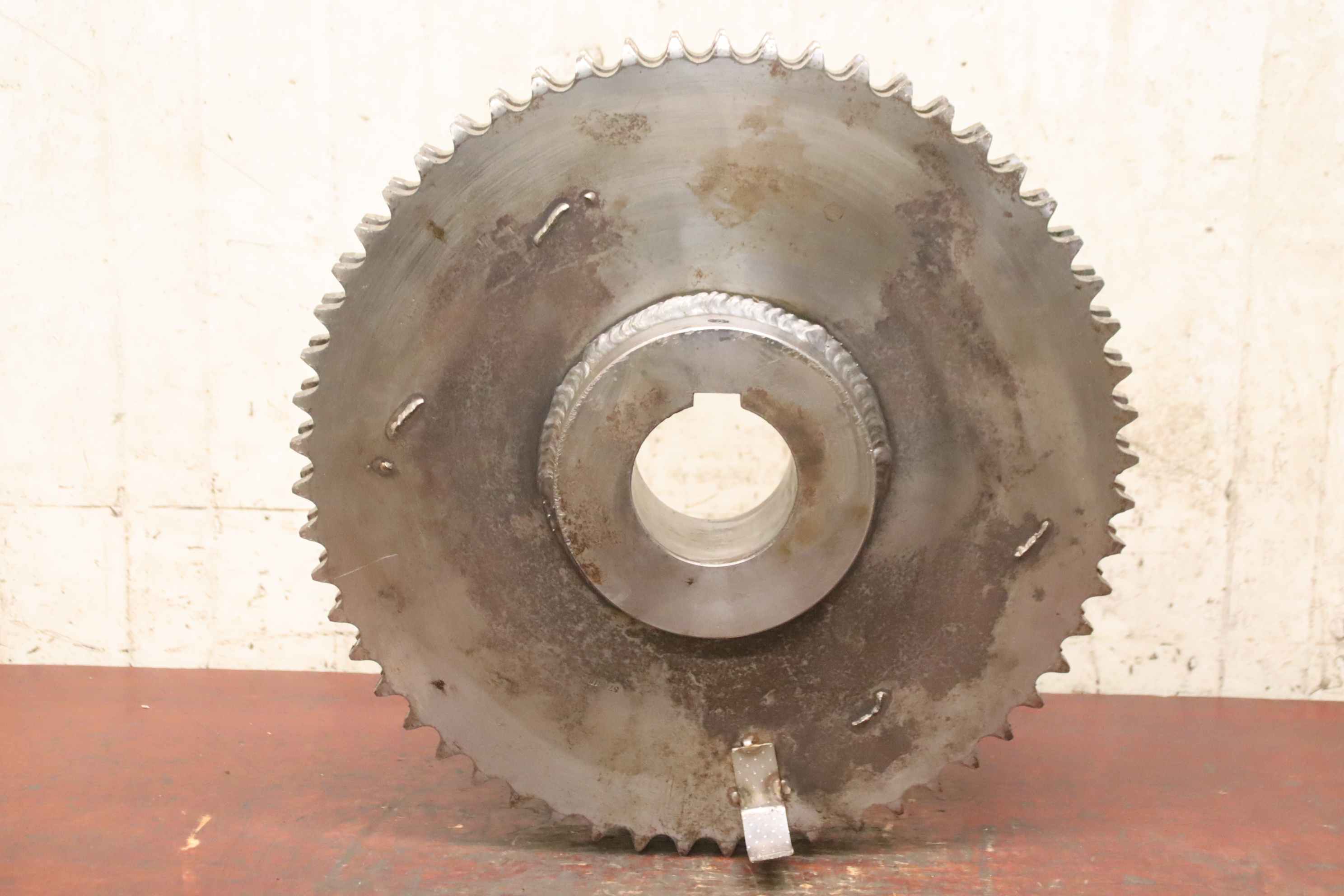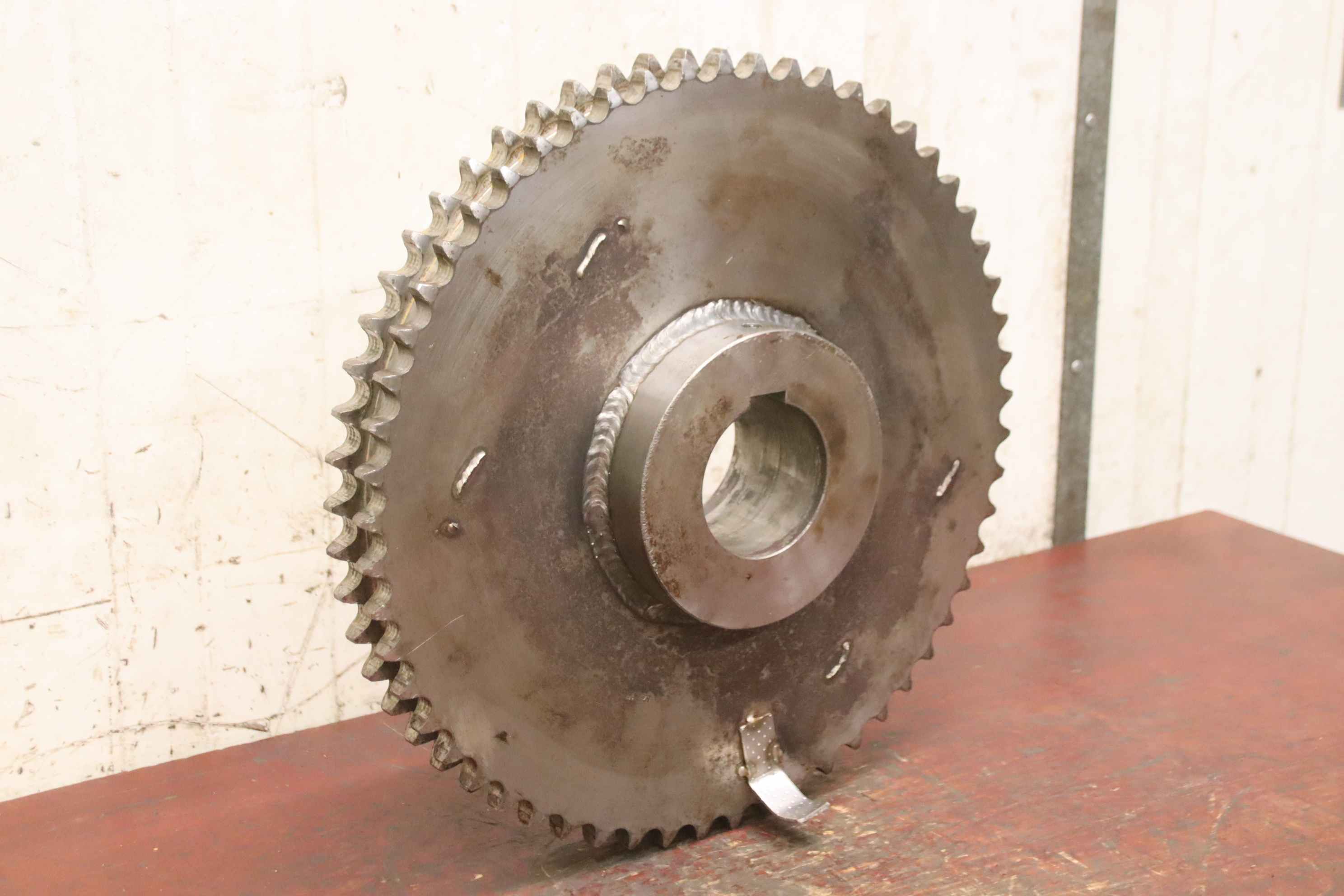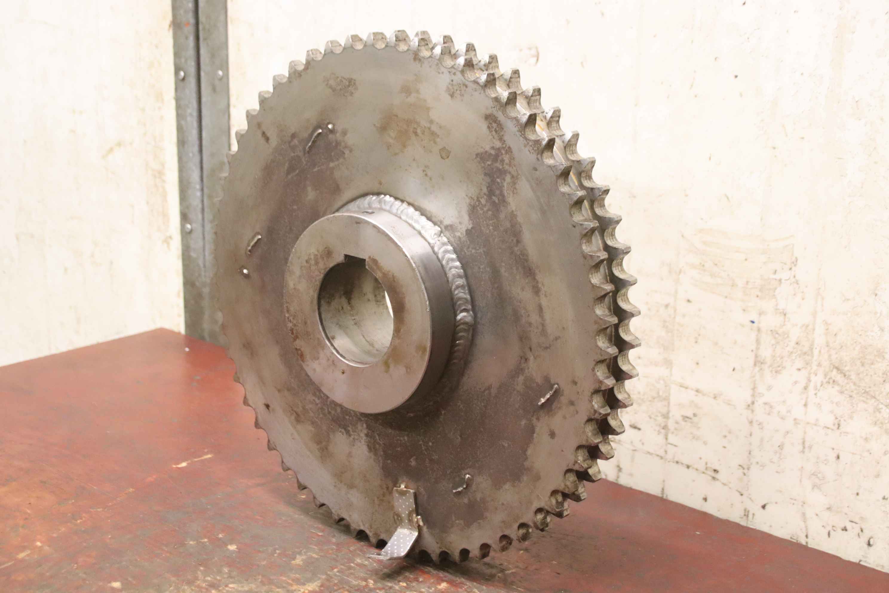 Sprocket, sprockets, single sprocket for roller chain, drive chain, duplex sprocket -Duplex sprocket: 1 x 17.02 mm 57 teeth -Diameter: 475 mm -Shaft holder: inner Ø 90 x 90 mm -Dimensions: see photos -Quantity: 1x piece available -Dimensions total: Ø 475 x 90 mm -Weight: 62 kg