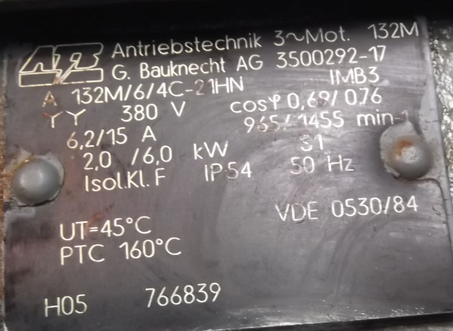 Electric motor, three-phase motor with 2 speeds-Power: 2/6 kW-Speed: 965/1455 rpm-Shaft: Ø 38 mm-Construction: B3-pole changing-Protection class: IP 54-Number: 3x available-Price: per piece-Dimensions: 480/320/H260 mm-Weight: 69 kg
